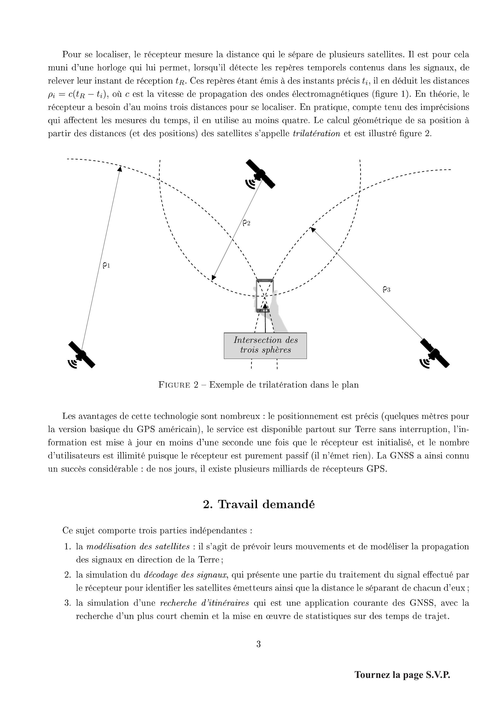 Pour se localiser, le récepteur mesure la distance qui le sépare de plusieurs satellites. Il est pour cela muni d'une horloge qui lui permet, lorsqu'il détecte les repères temporels contenus dans les signaux, de relever leur instant de réception . Ces repères étant émis à des instants précis , il en déduit les distances , où est la vitesse de propagation des ondes électromagnétiques (figure 1). En théorie, le récepteur a besoin d'au moins trois distances pour se localiser. En pratique, compte tenu des imprécisions qui affectent les mesures du temps, il en utilise au moins quatre. Le calcul géométrique de sa position à partir des distances (et des positions) des satellites s'appelle trilatération et est illustré figure 2.