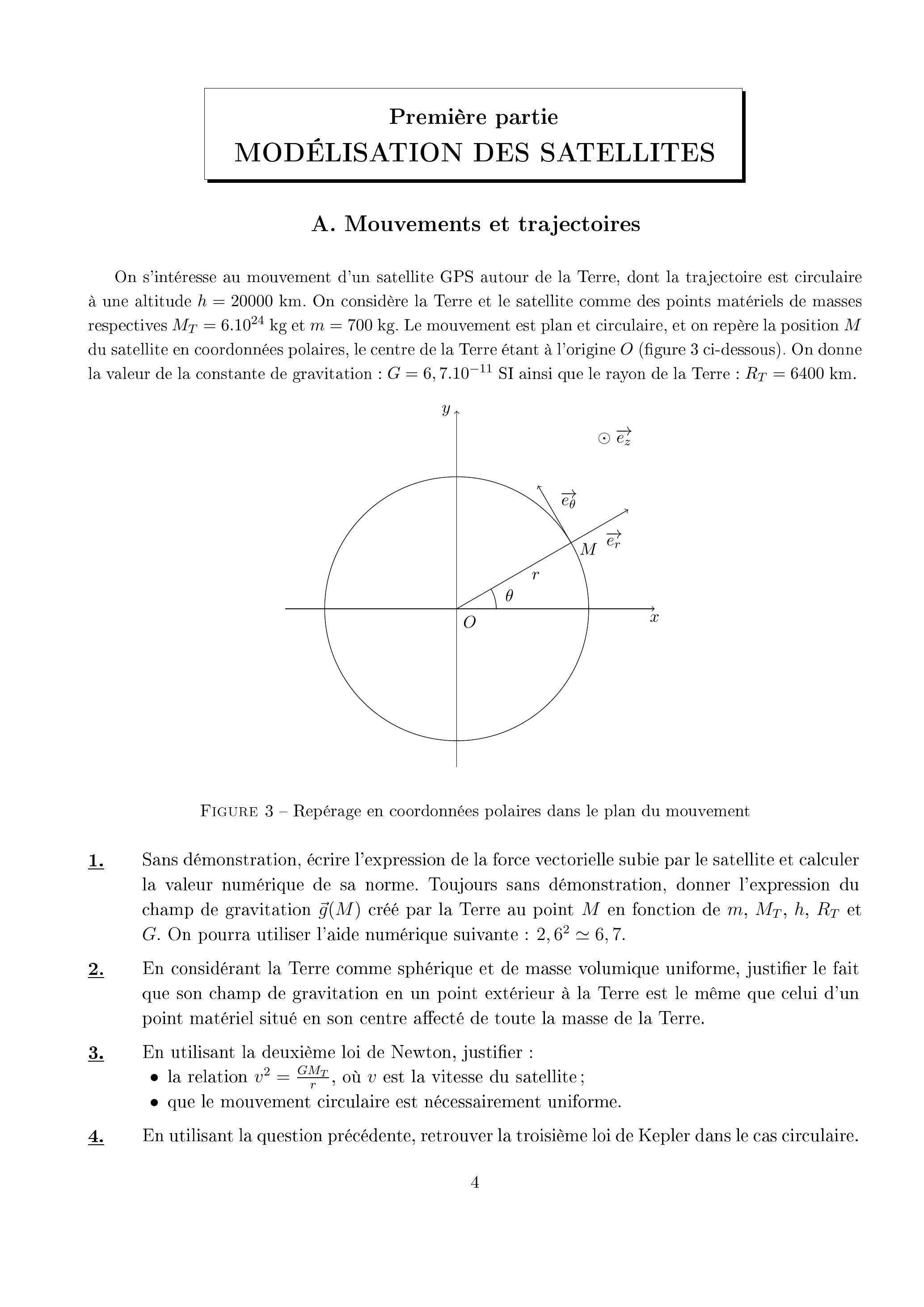 On s'intéresse au mouvement d'un satellite GPS autour de la Terre, dont la trajectoire est circulaire à une altitude . On considère la Terre et le satellite comme des points matériels de masses respectives et . Le mouvement est plan et circulaire, et on repère la position du satellite en coordonnées polaires, le centre de la Terre étant à l'origine (figure 3 ci-dessous). On donne la valeur de la constante de gravitation : SI ainsi que le rayon de la Terre : .