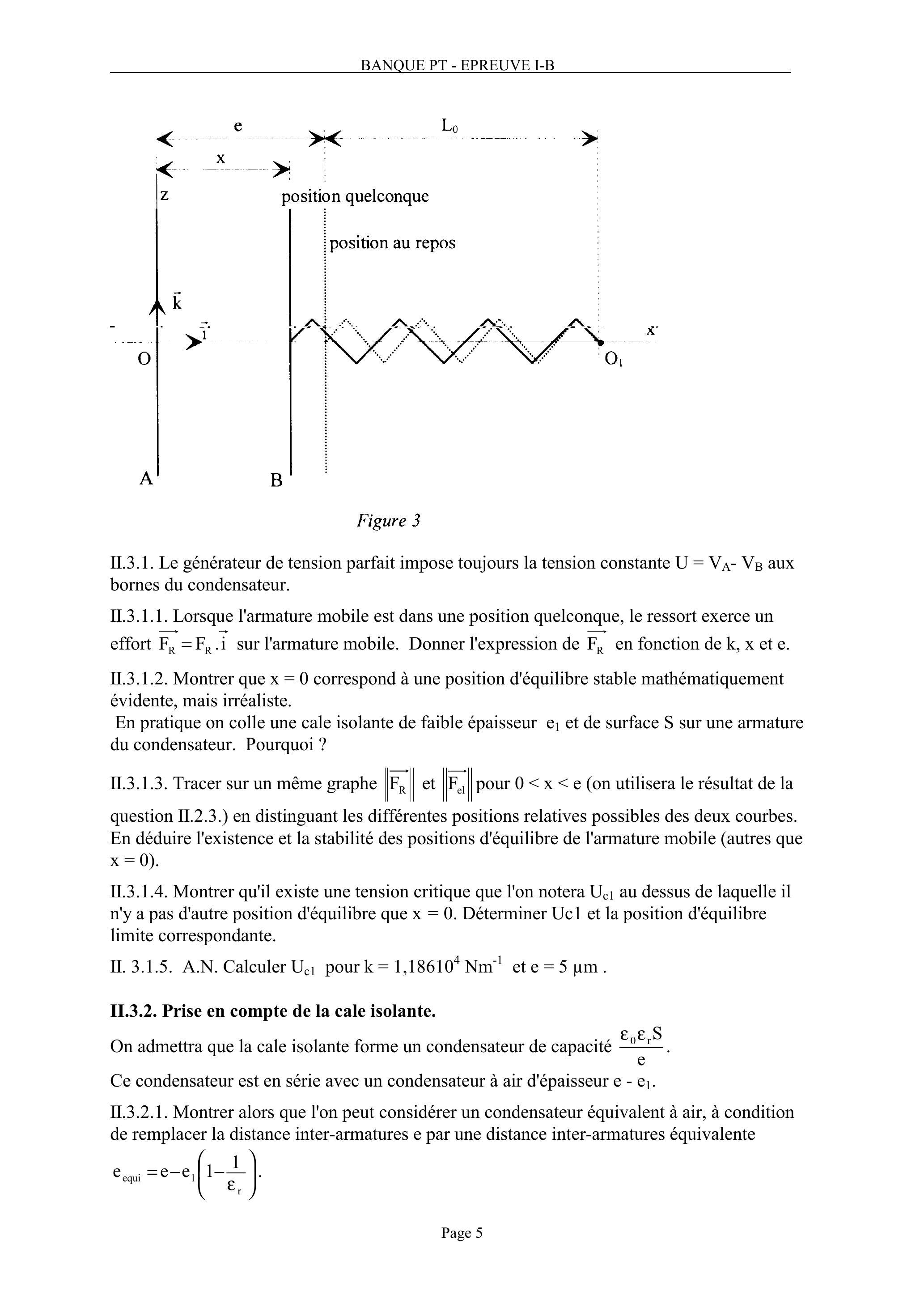 On remplace maintenant l'opérateur par un ressort d'axe Ox , de raideur k et de longueur à vide . Une des extrémités du ressort est fixée sur le point tel que et l'autre extrémité est fixée sur l'armature mobile B . Lorsque le condensateur est déchargé, la distance inter-armatures vaut e, et la longueur du ressort est (figure 3).