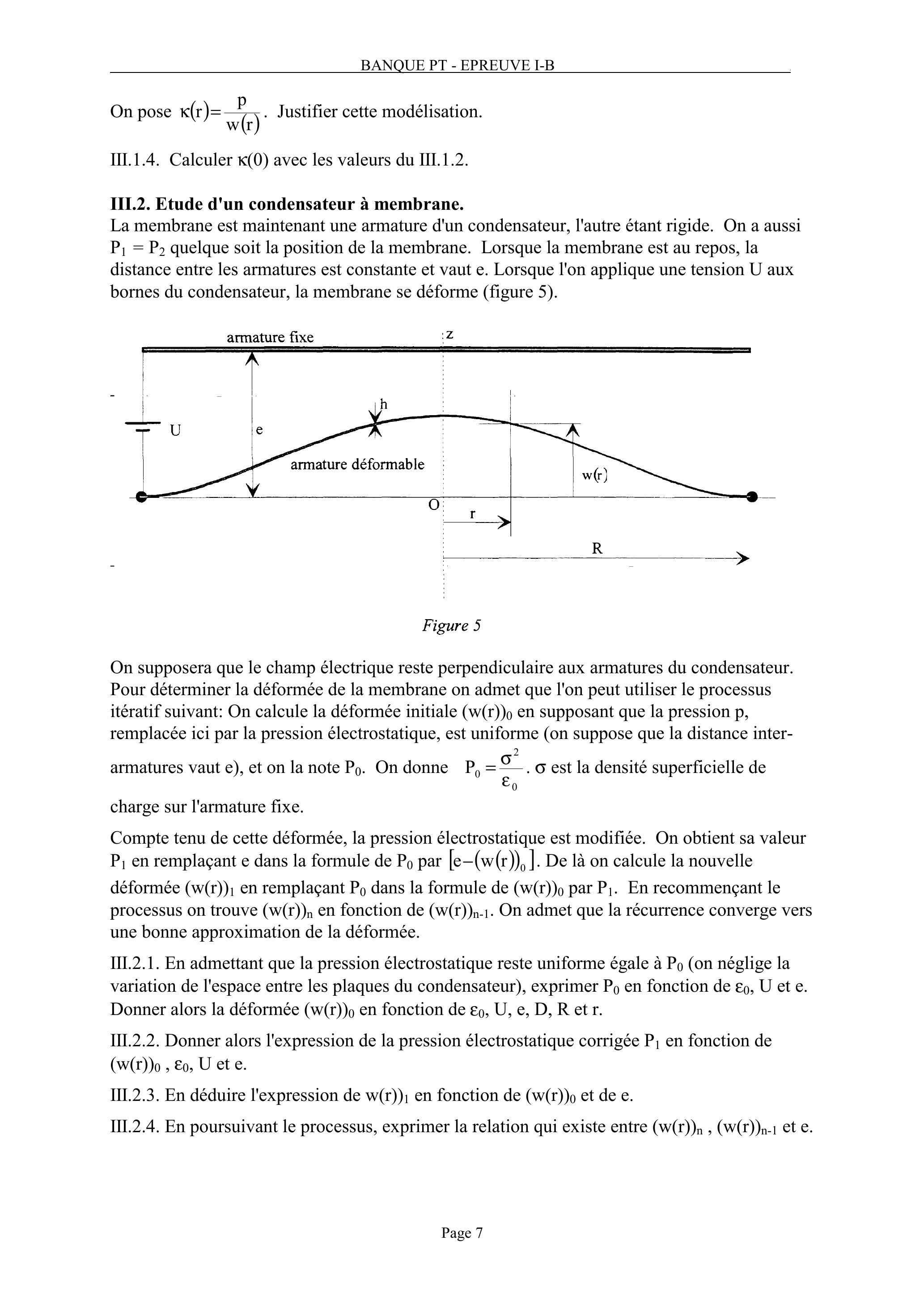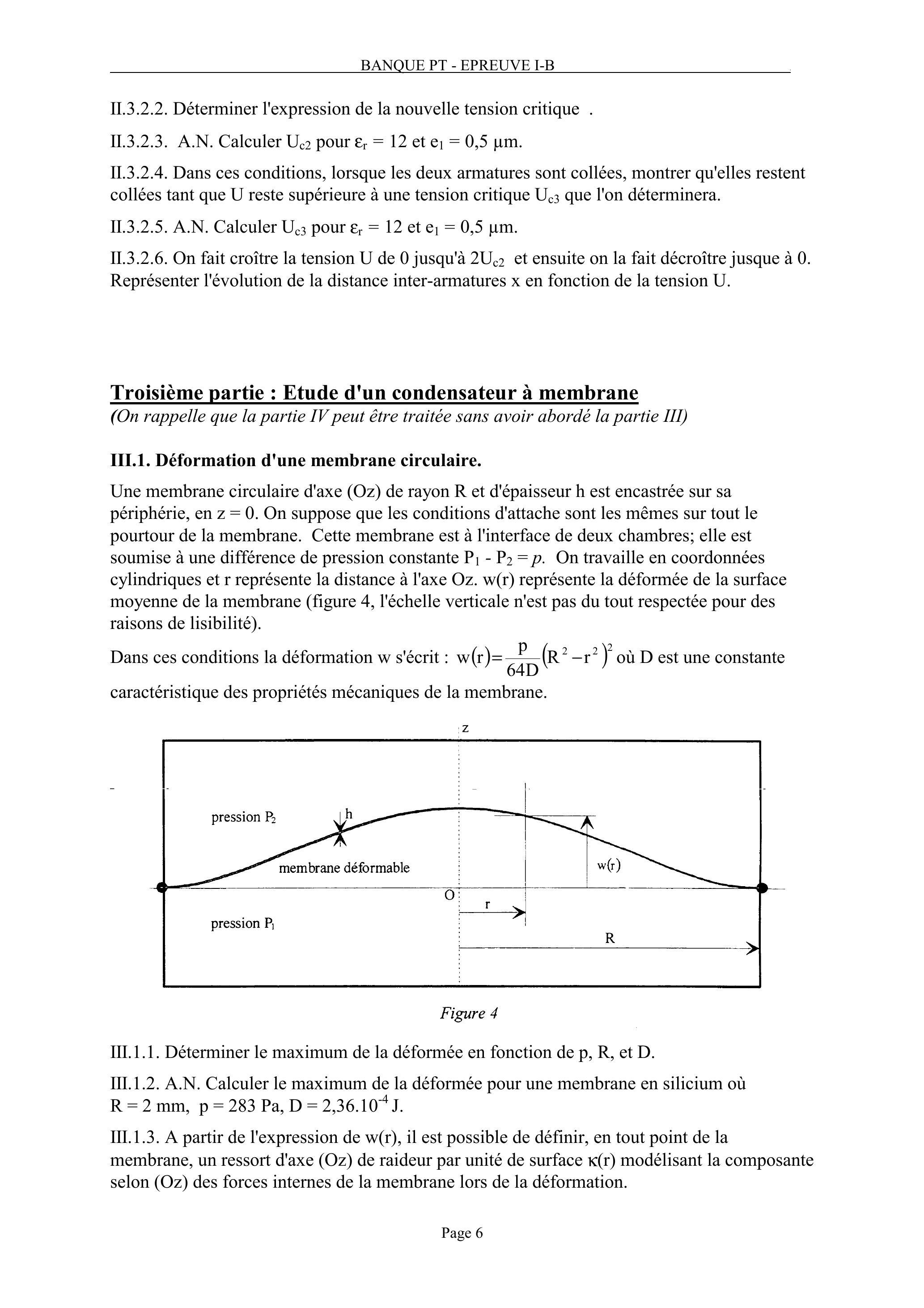 III.2.1. En admettant que la pression électrostatique reste uniforme égale à (on néglige la variation de l'espace entre les plaques du condensateur), exprimer en fonction de et e. Donner alors la déformée en fonction de et r .