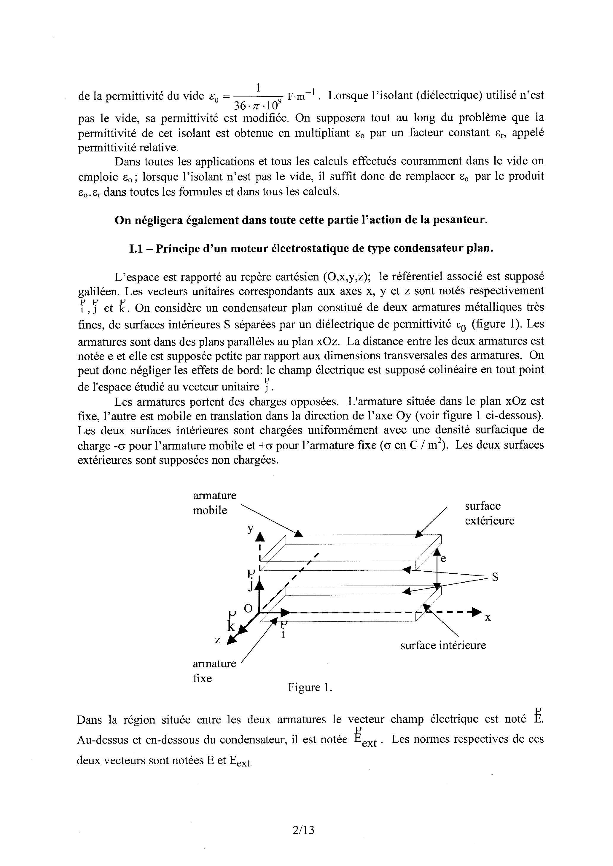 I. 1 - Principe d'un moteur électrostatique de type condensateur plan.