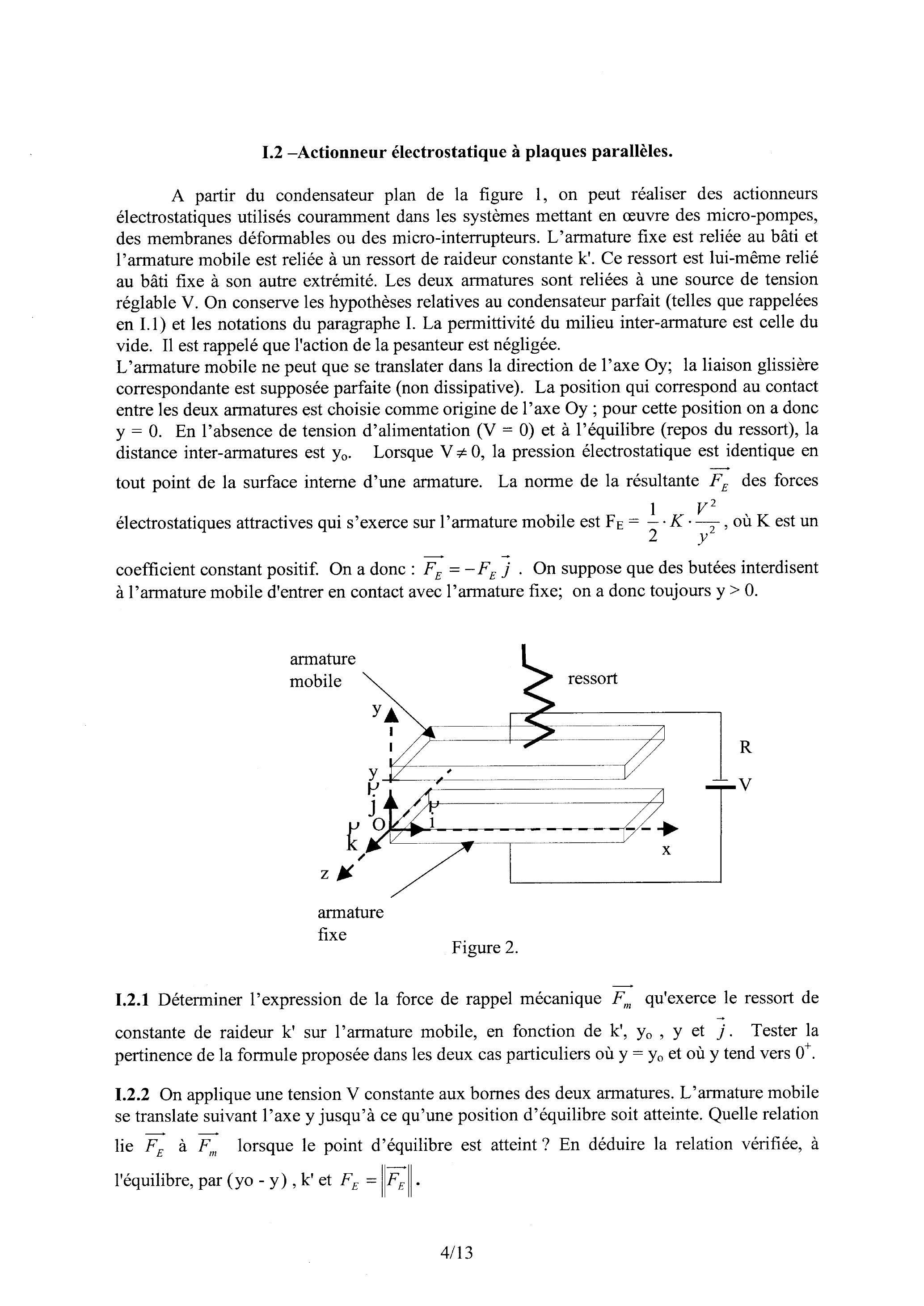 A partir du condensateur plan de la figure 1, on peut réaliser des actionneurs électrostatiques utilisés couramment dans les systèmes mettant en œuvre des micro-pompes, des membranes déformables ou des micro-interrupteurs. L'armature fixe est reliée au bâti et l'armature mobile est reliée à un ressort de raideur constante k '. Ce ressort est lui-même relié au bâti fixe à son autre extrémité. Les deux armatures sont reliées à une source de tension réglable V . On conserve les hypothèses relatives au condensateur parfait (telles que rappelées en I.1) et les notations du paragraphe I. La permittivité du milieu inter-armature est celle du vide. Il est rappelé que l'action de la pesanteur est négligée.