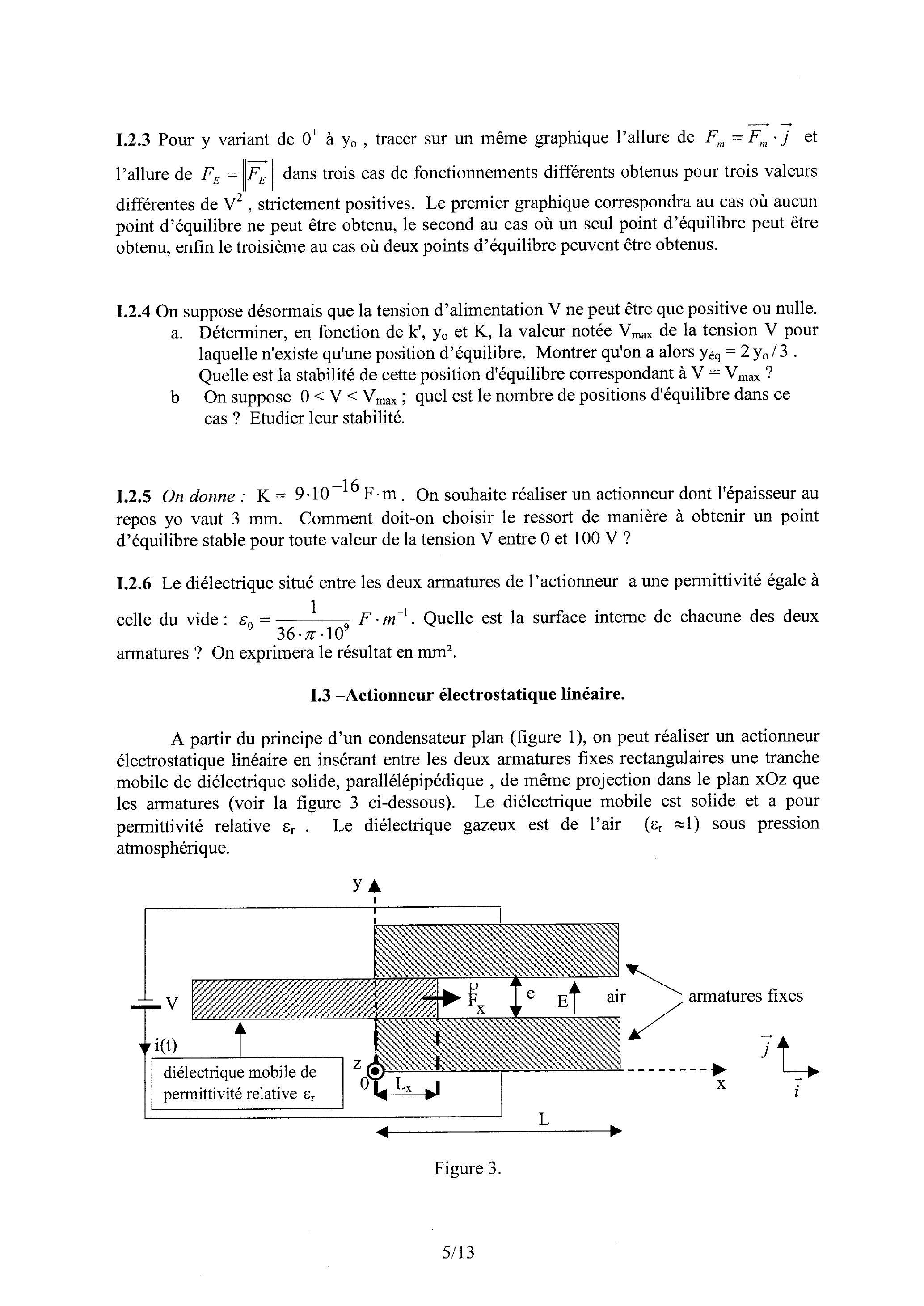 L'armature mobile ne peut que se translater dans la direction de l'axe Oy ; la liaison glissière correspondante est supposée parfaite (non dissipative). La position qui correspond au contact entre les deux armatures est choisie comme origine de l'axe Oy ; pour cette position on a donc . En l'absence de tension d'alimentation ( ) et à l'équilibre (repos du ressort), la distance inter-armatures est . Lorsque , la pression électrostatique est identique en tout point de la surface interne d'une armature. La norme de la résultante des forces électrostatiques attractives qui s'exerce sur l'armature mobile est , où K est un coefficient constant positif. On a donc : . On suppose que des butées interdisent à l'armature mobile d'entrer en contact avec l'armature fixe; on a donc toujours y .