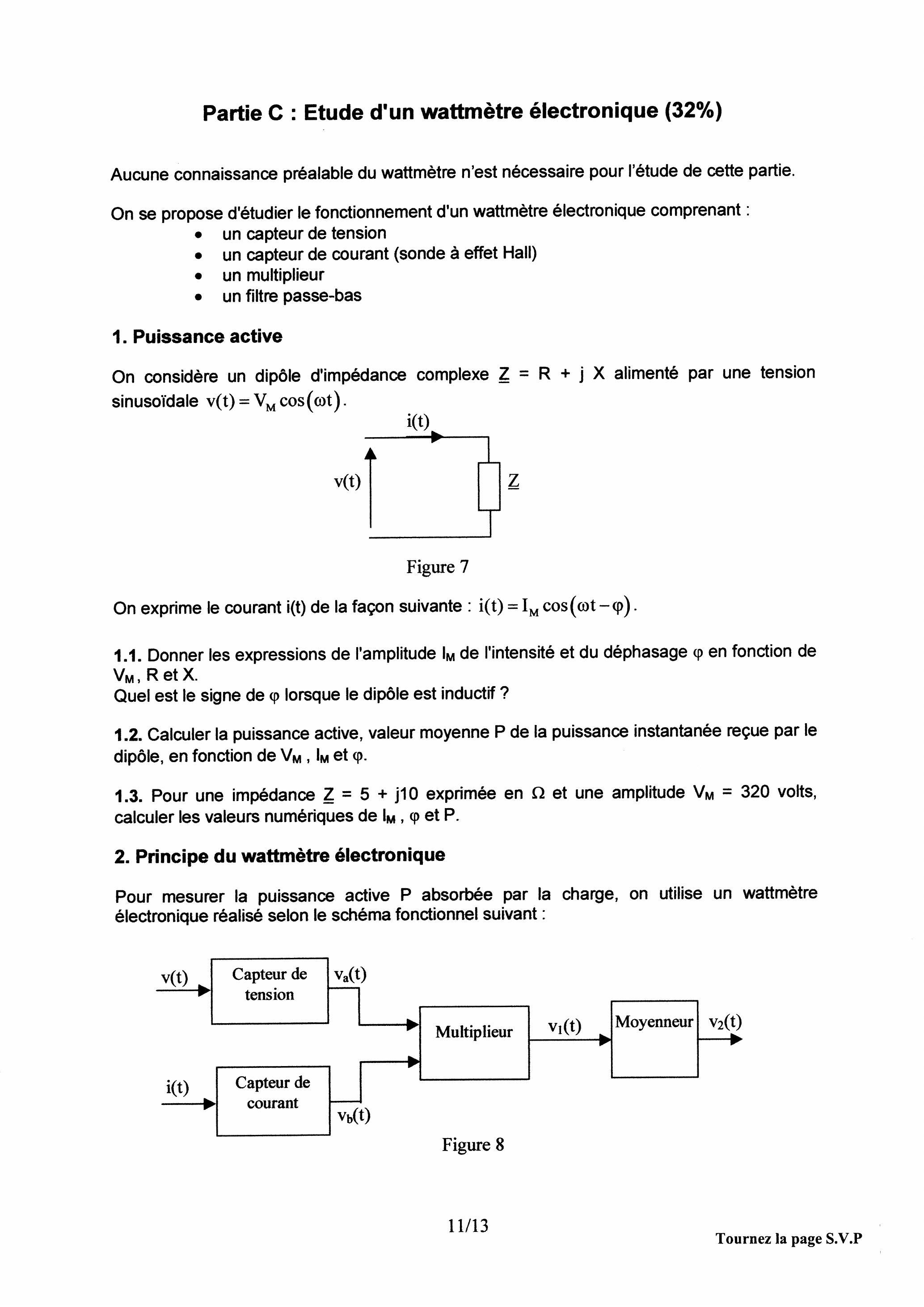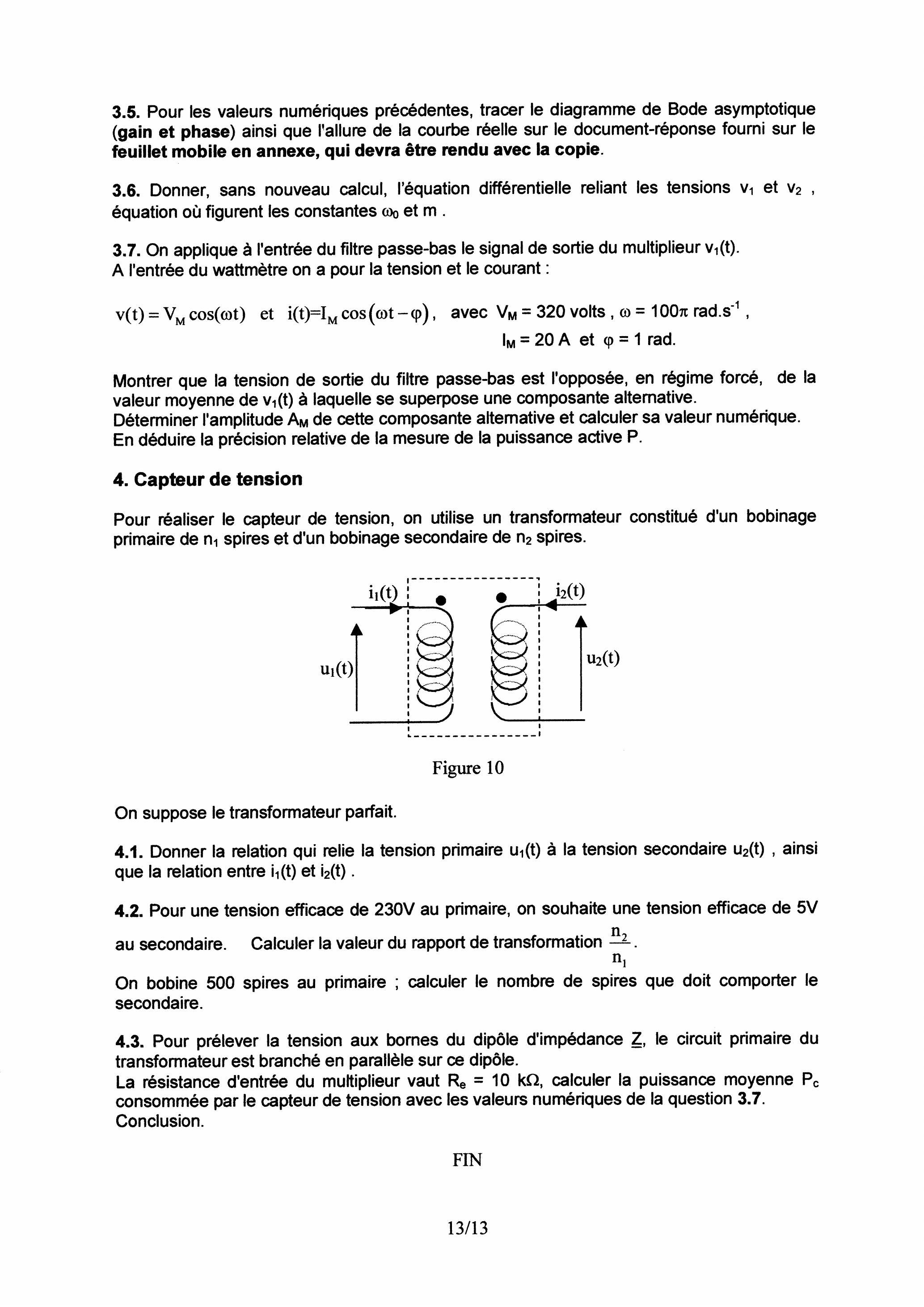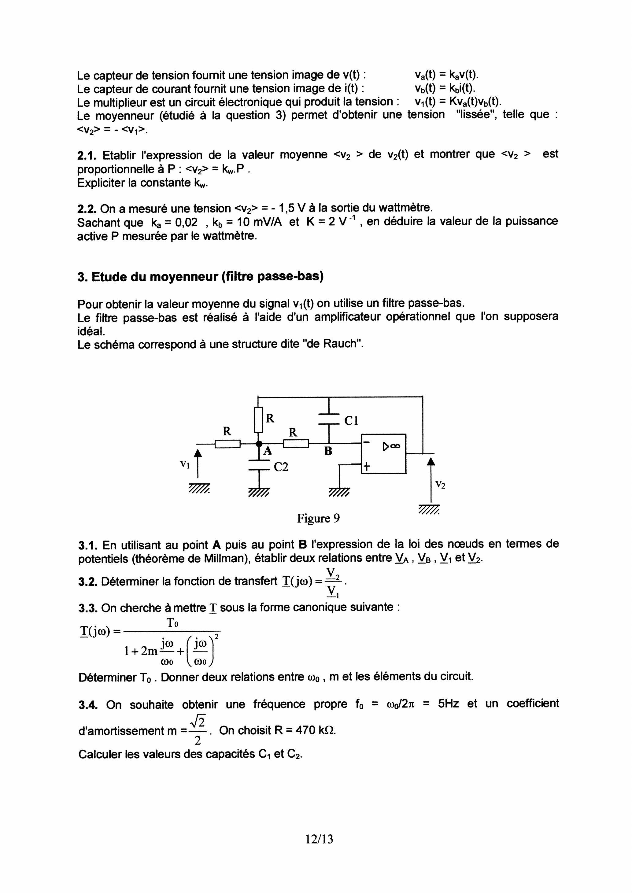 La résistance d'entrée du multiplieur vaut , calculer la puissance moyenne consommée par le capteur de tension avec les valeurs numériques de la question 3.7. Conclusion.