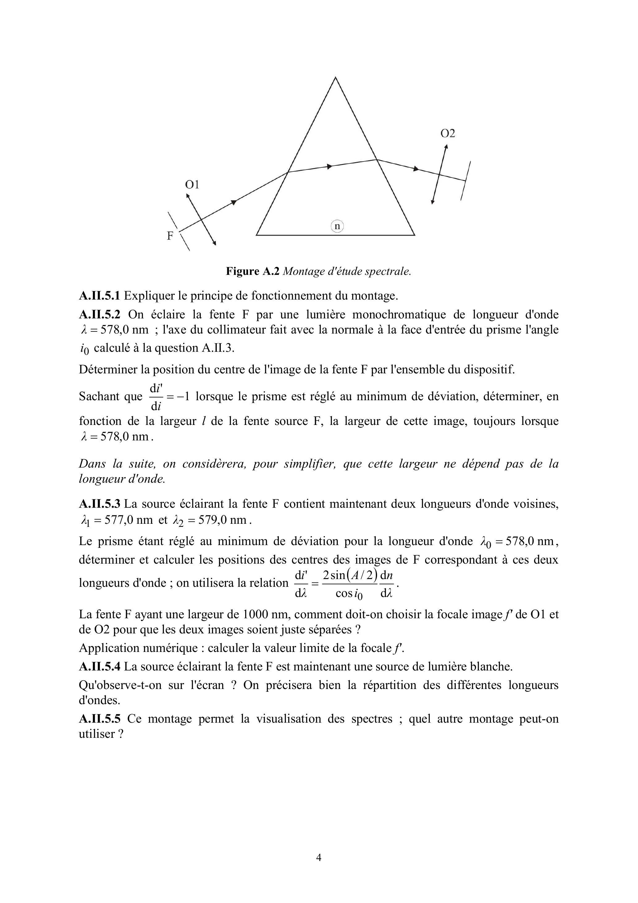 A.II.5.2 On éclaire la fente F par une lumière monochromatique de longueur d'onde ; l'axe du collimateur fait avec la normale à la face d'entrée du prisme l'angle calculé à la question A.II.3.