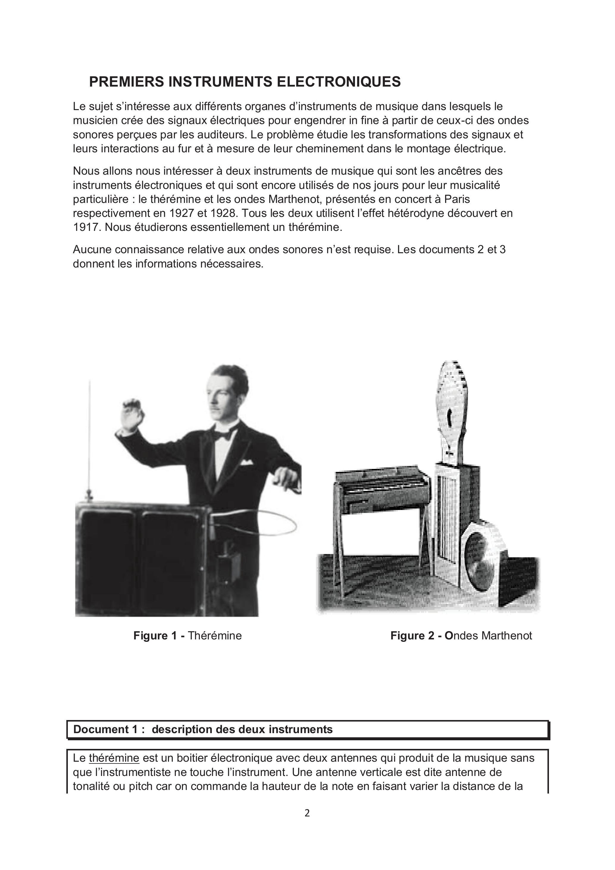 Nous allons nous intéresser à deux instruments de musique qui sont les ancêtres des instruments électroniques et qui sont encore utilisés de nos jours pour leur musicalité particulière : le thérémine et les ondes Marthenot, présentés en concert à Paris respectivement en 1927 et 1928. Tous les deux utilisent l'effet hétérodyne découvert en 1917. Nous étudierons essentiellement un thérémine.