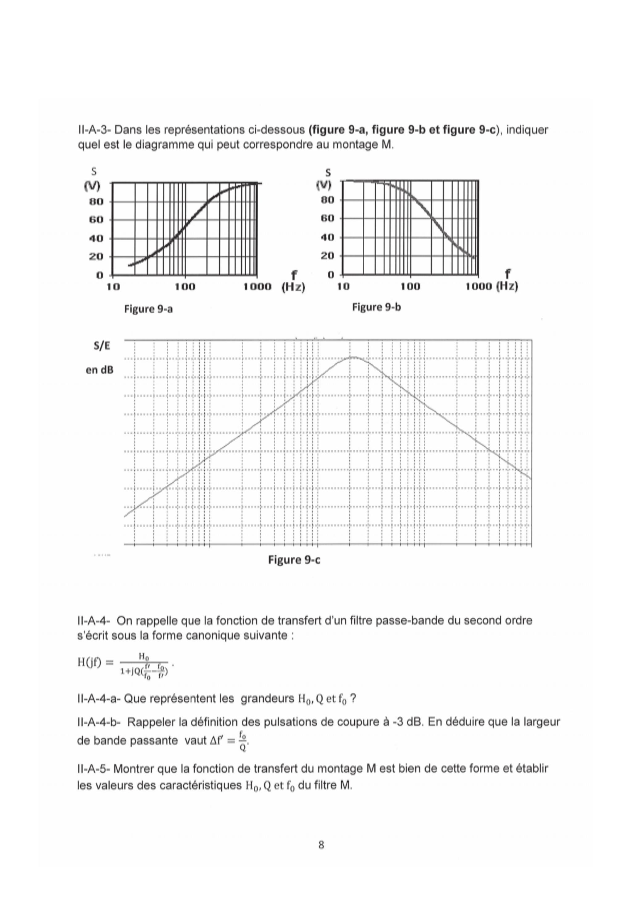 II-A-5- Montrer que la fonction de transfert du montage M est bien de cette forme et établir les valeurs des caractéristiques , et du filtre .