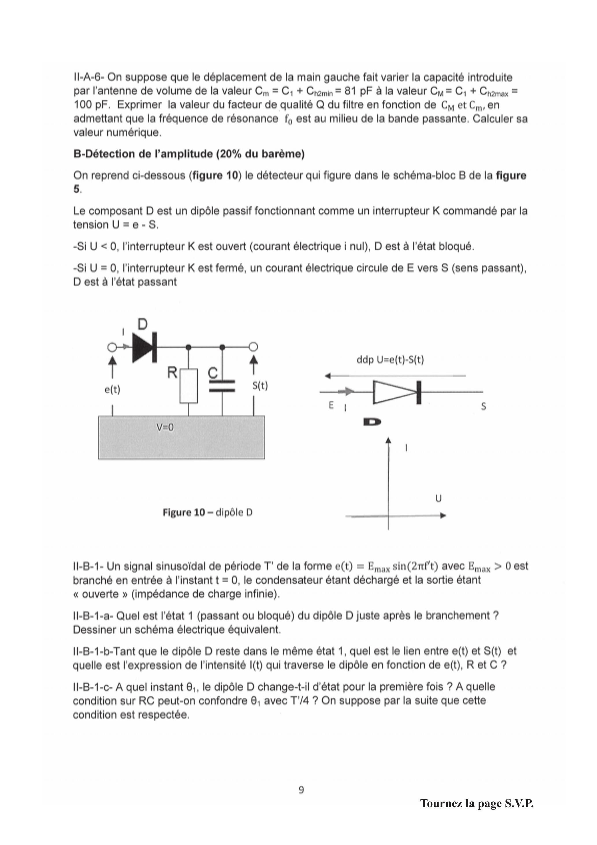 II-A-6- On suppose que le déplacement de la main gauche fait varier la capacité introduite par l'antenne de volume de la valeur à la valeur 100 pF . Exprimer la valeur du facteur de qualité du filtre en fonction de et , en admettant que la fréquence de résonance est au milieu de la bande passante. Calculer sa valeur numérique.