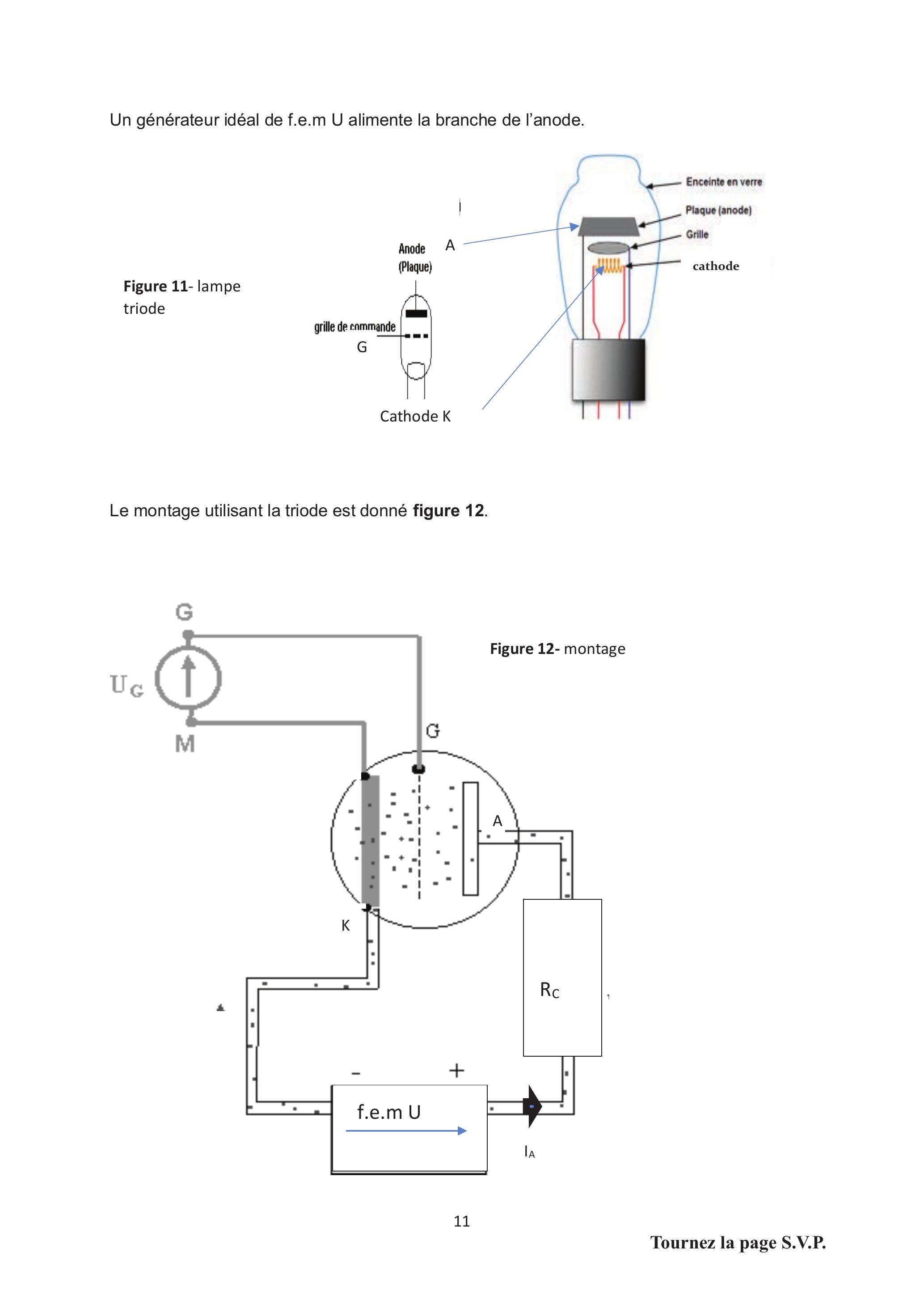 Une triode (figure 11) est un composant électronique formé d'une ampoule à vide dans laquelle sont insérées trois électrodes : une cathode K maintenue à un potentiel nul, une anode A (plaque) portée à un potentiel positif et une grille G portée à un potentiel négatif. A l'aide d'un dispositif annexe non représenté, on porte !a cathode K à une température suffisante pour qu'elle émette des électrons.