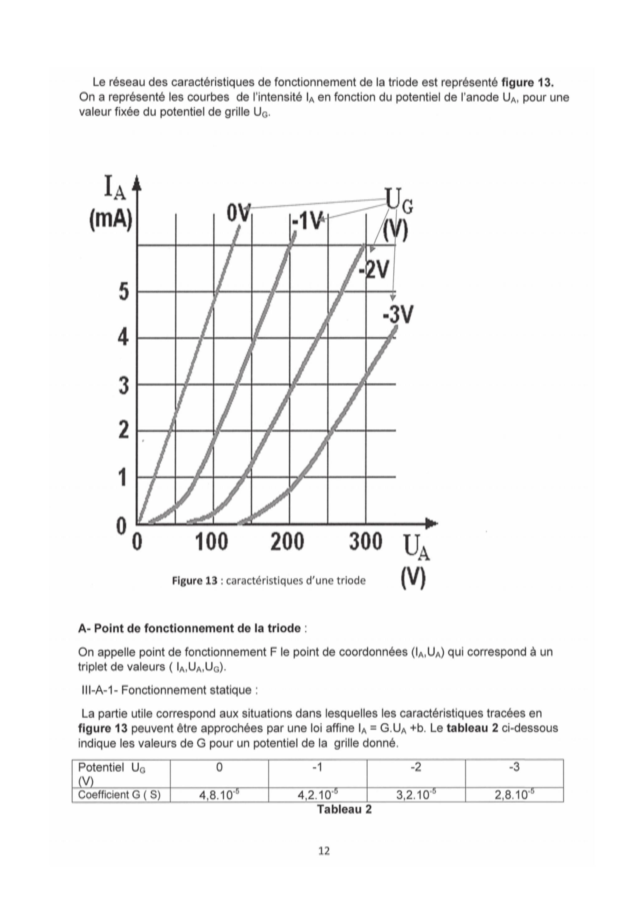 Le réseau des caractéristiques de fonctionnement de la triode est représenté figure 13. On a représenté les courbes de l'intensité en fonction du potentiel de l'anode , pour une valeur fixée du potentiel de grille .