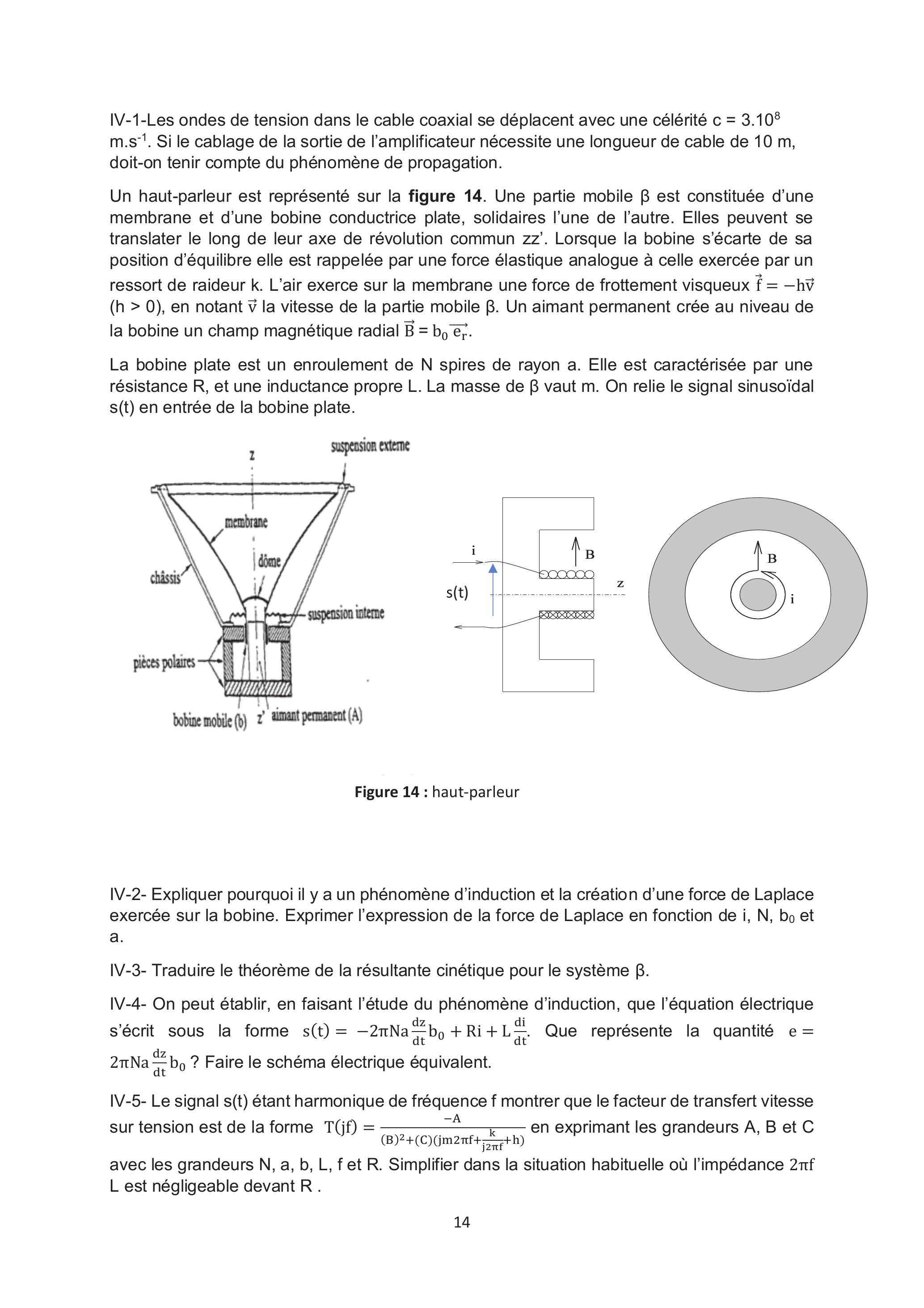 Un haut-parleur est représenté sur la figure 14. Une partie mobile est constituée d'une membrane et d'une bobine conductrice plate, solidaires l'une de l'autre. Elles peuvent se translater le long de leur axe de révolution commun zz'. Lorsque la bobine s'écarte de sa position d'équilibre elle est rappelée par une force élastique analogue à celle exercée par un ressort de raideur . L'air exerce sur la membrane une force de frottement visqueux ( ), en notant la vitesse de la partie mobile . Un aimant permanent crée au niveau de la bobine un champ magnétique radial .