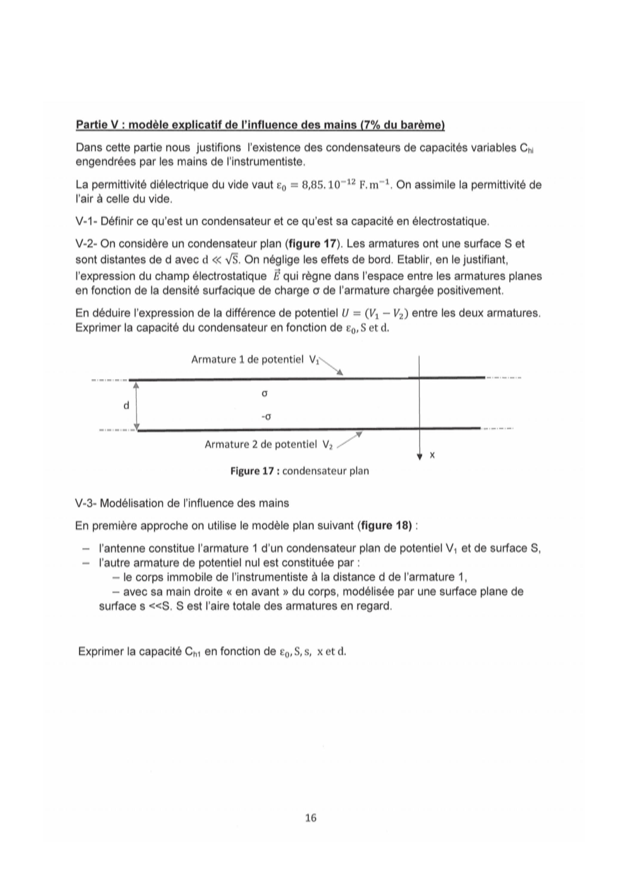 Des études sur les antennes conduisent à une évaluation de la capacité de la forme en absence d'instrumentiste. La présence de l'instrumentiste avec une main à la distance x introduit une modification de la capacité égale à . Calculer l'ordre de grandeur de pour une antenne de hauteur , de diamètre avec une distance entre la main droite et l'antenne. On donne .