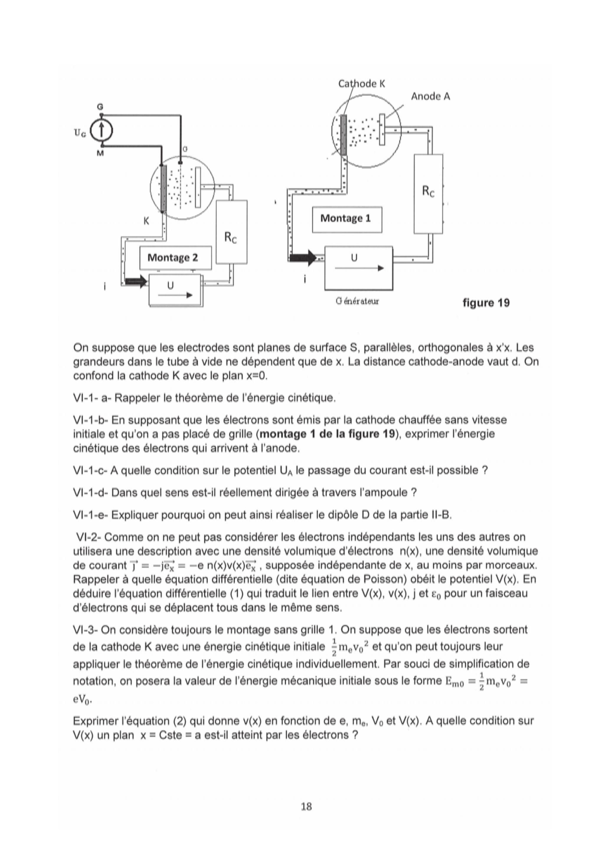 VI-1-b- En supposant que les électrons sont émis par la cathode chauffée sans vitesse initiale et qu'on a pas placé de grille (montage 1 de la figure 19), exprimer l'énergie cinétique des électrons qui arrivent à l'anode.