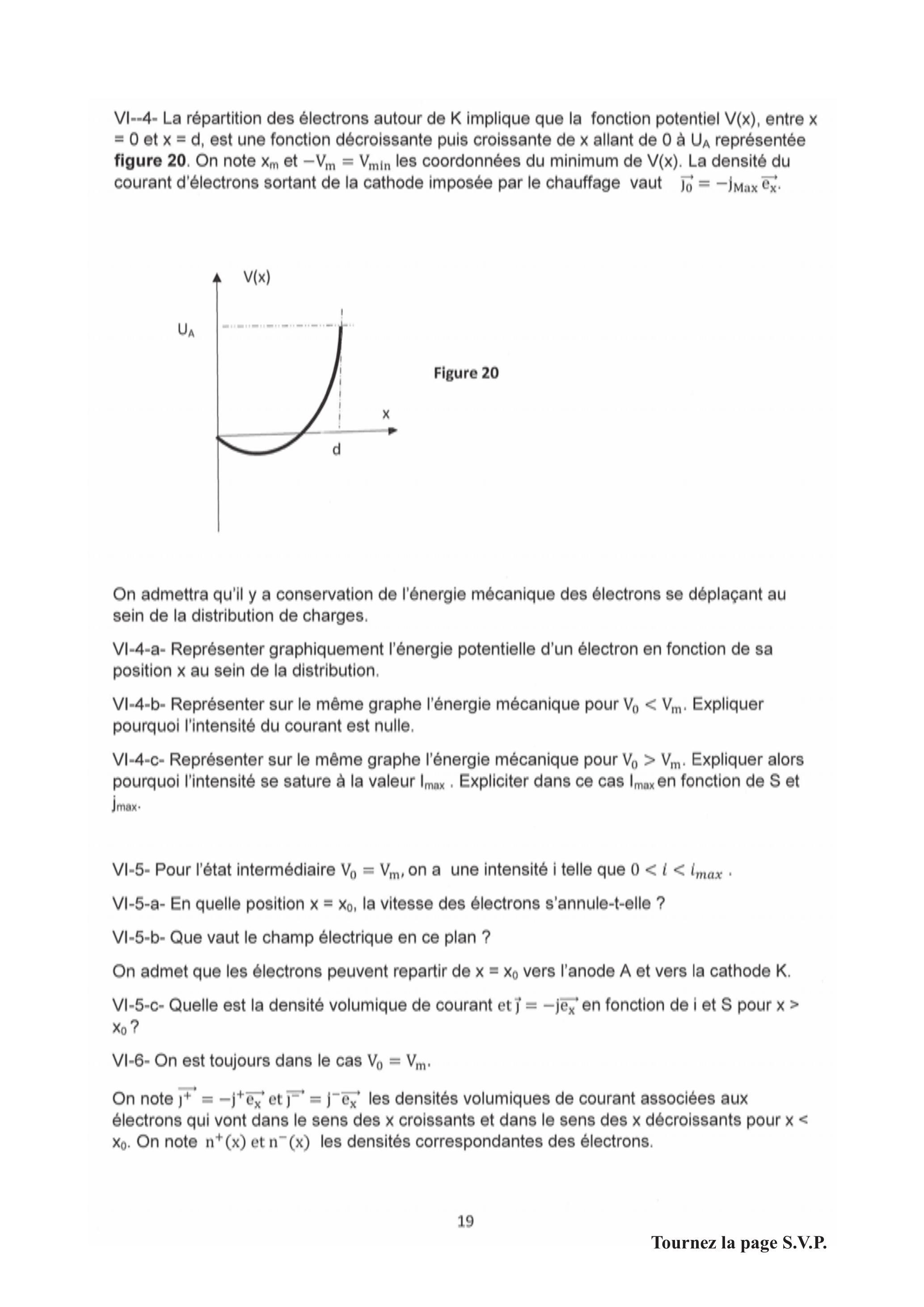 VI--4- La répartition des électrons autour de K implique que la fonction potentiel , entre x et , est une fonction décroissante puis croissante de x allant de 0 à représentée figure 20. On note et les coordonnées du minimum de . La densité du courant d'électrons sortant de la cathode imposée par le chauffage vaut .