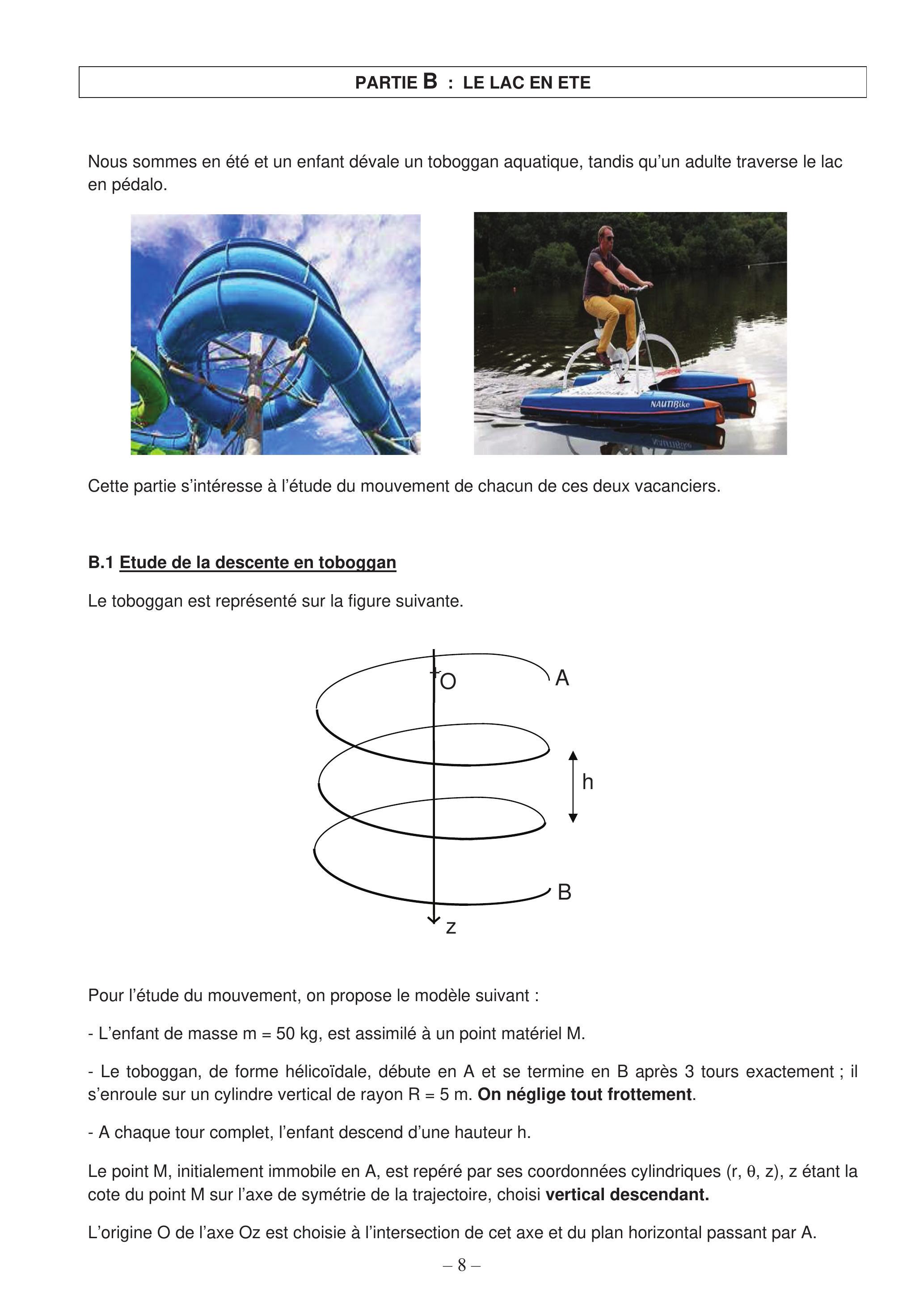 Le toboggan, de forme hélicoïdale, débute en et se termine en après 3 tours exactement ; il s'enroule sur un cylindre vertical de rayon . On néglige tout frottement.