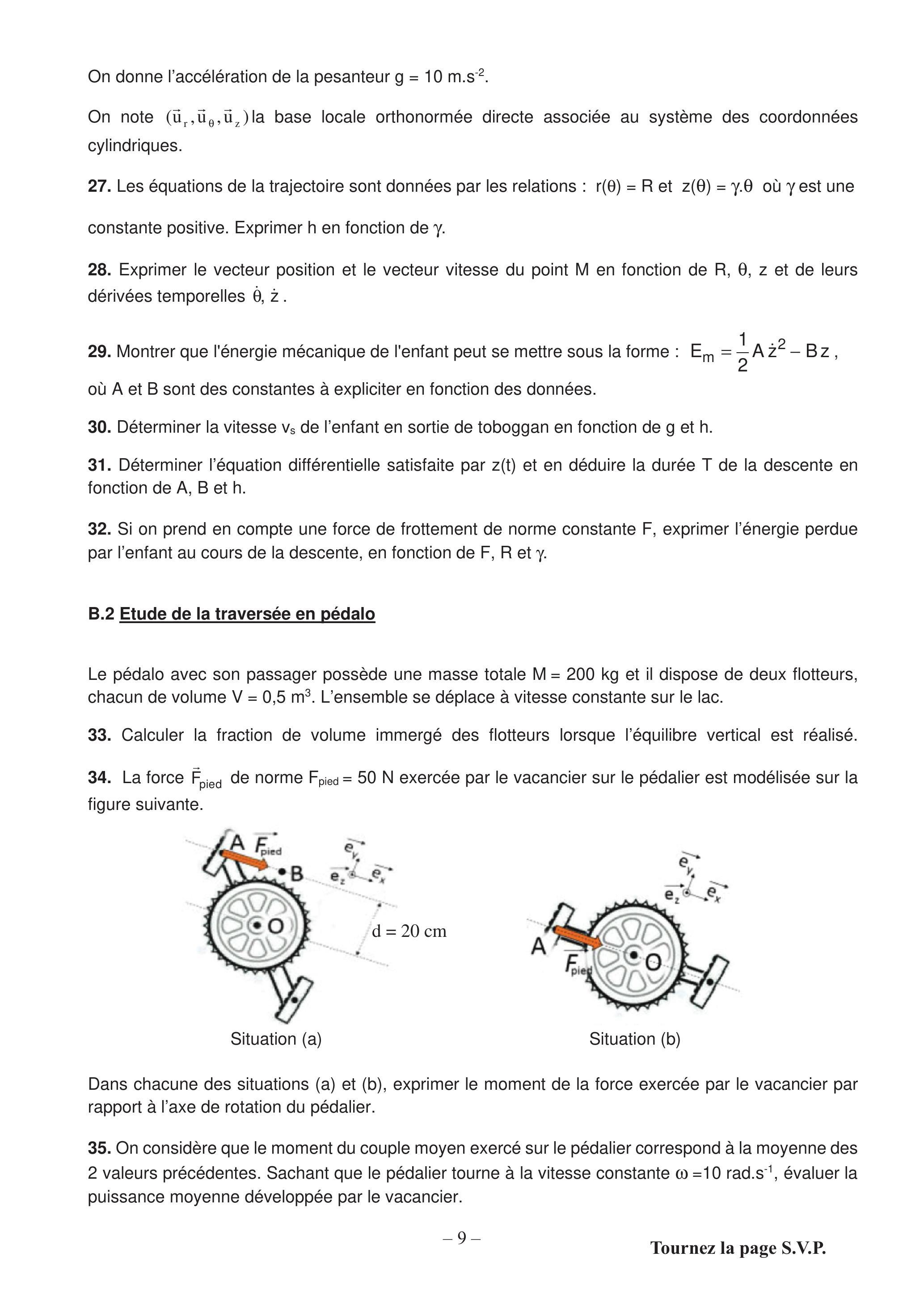 35. On considère que le moment du couple moyen exercé sur le pédalier correspond à la moyenne des 2 valeurs précédentes. Sachant que le pédalier tourne à la vitesse constante rad. , évaluer la puissance moyenne développée par le vacancier.