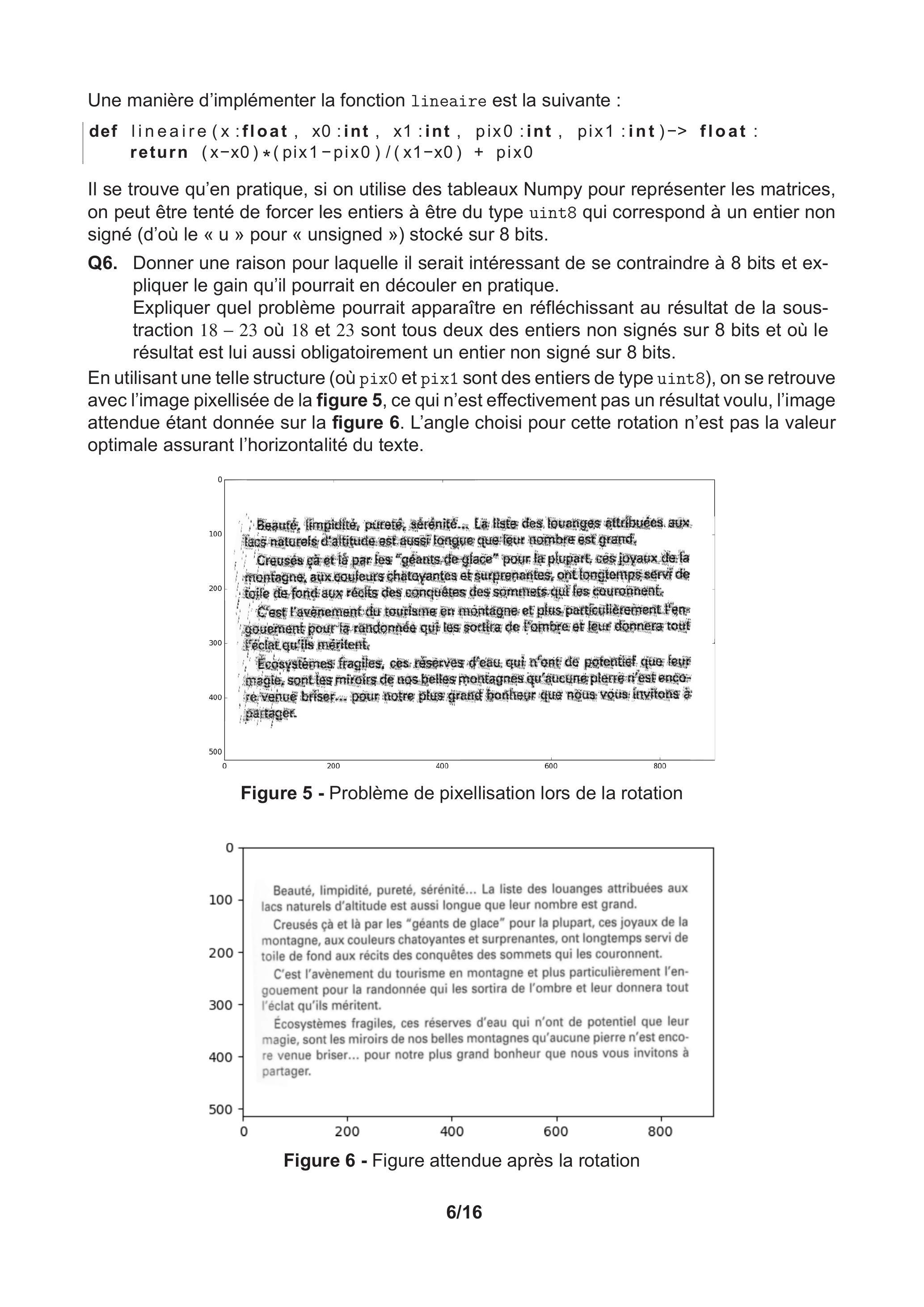En utilisant une telle structure (où pix0 et pix1 sont des entiers de type uint8), on se retrouve avec l'image pixellisée de la figure 5, ce qui n'est effectivement pas un résultat voulu, l'image attendue étant donnée sur la figure 6. L'angle choisi pour cette rotation n'est pas la valeur optimale assurant l'horizontalité du texte.