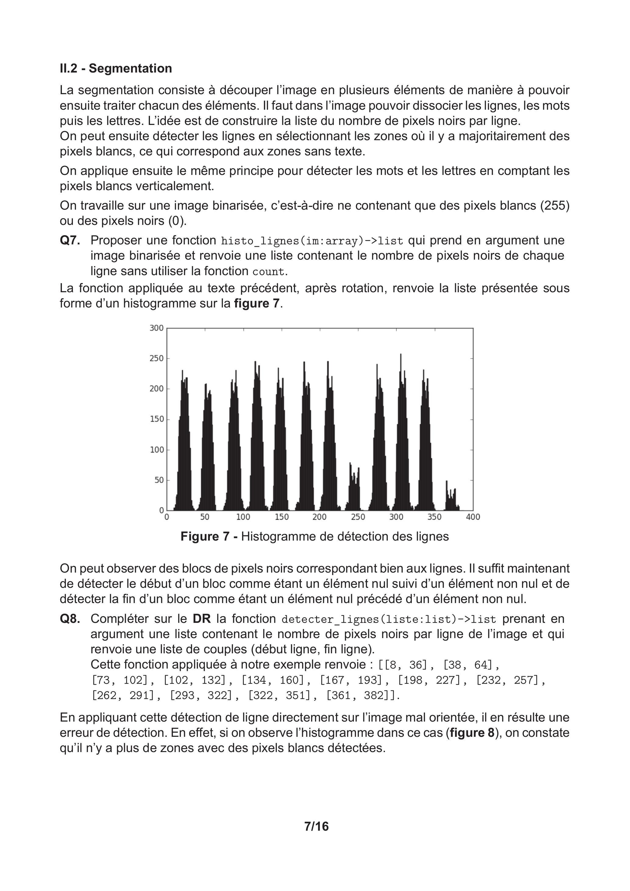 Q7. Proposer une fonction histo_lignes(im:array)->list qui prend en argument une image binarisée et renvoie une liste contenant le nombre de pixels noirs de chaque ligne sans utiliser la fonction count.