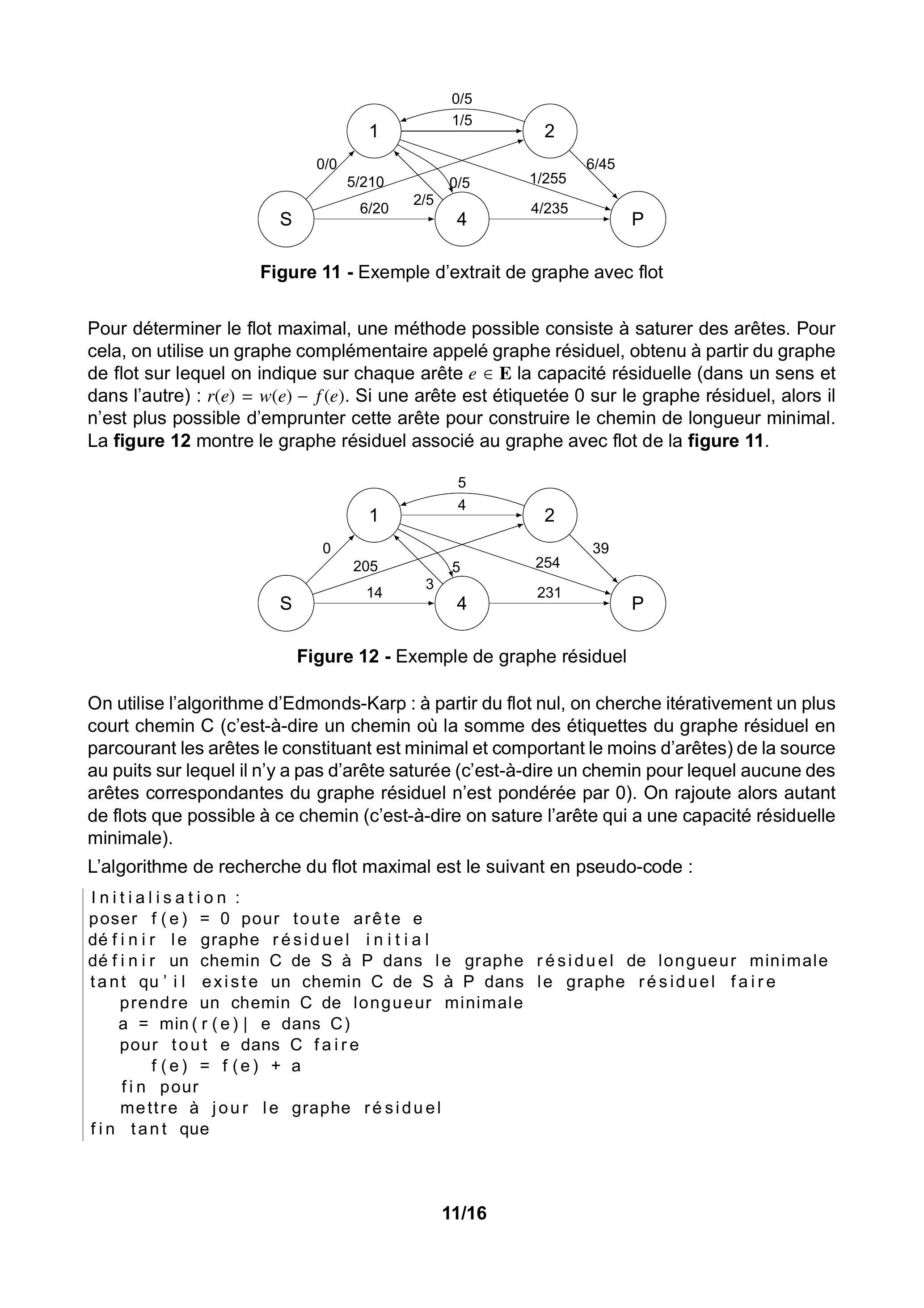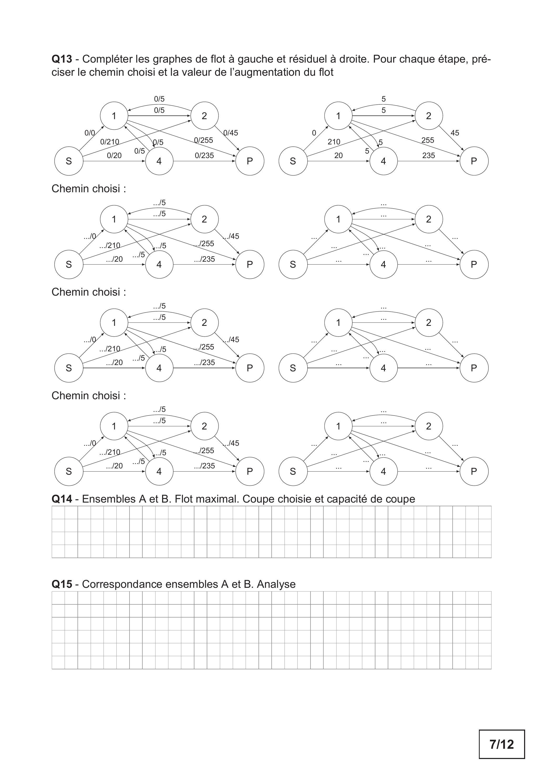Q13 - Compléter les graphes de flot à gauche et résiduel à droite. Pour chaque étape, préciser le chemin choisi et la valeur de l'augmentation du flot