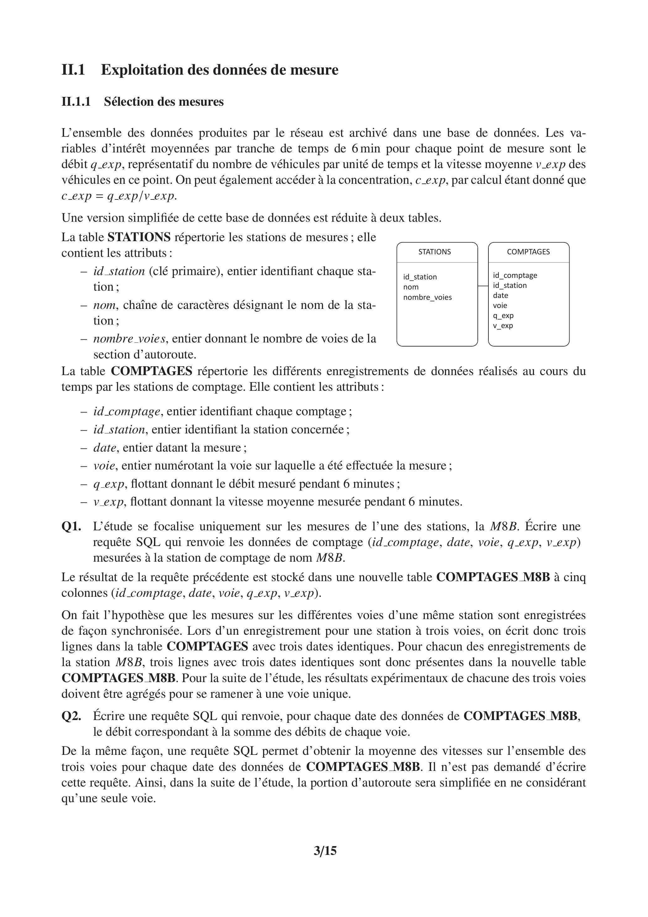 Q1. L'étude se focalise uniquement sur les mesures de l'une des stations, la . Écrire une requête SQL qui renvoie les données de comptage (id_comptage, date, voie, q_exp, v_exp) mesurées à la station de comptage de nom .