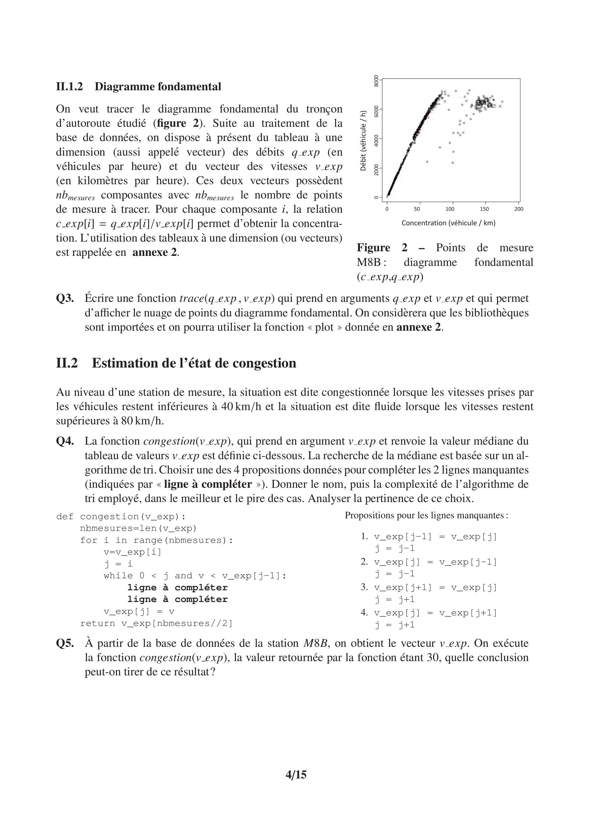 Q4. La fonction congestion(v_exp), qui prend en argument v_exp et renvoie la valeur médiane du tableau de valeurs exp est définie ci-dessous. La recherche de la médiane est basée sur un algorithme de tri. Choisir une des 4 propositions données pour compléter les 2 lignes manquantes (indiquées par «ligne à compléter»). Donner le nom, puis la complexité de l'algorithme de tri employé, dans le meilleur et le pire des cas. Analyser la pertinence de ce choix.