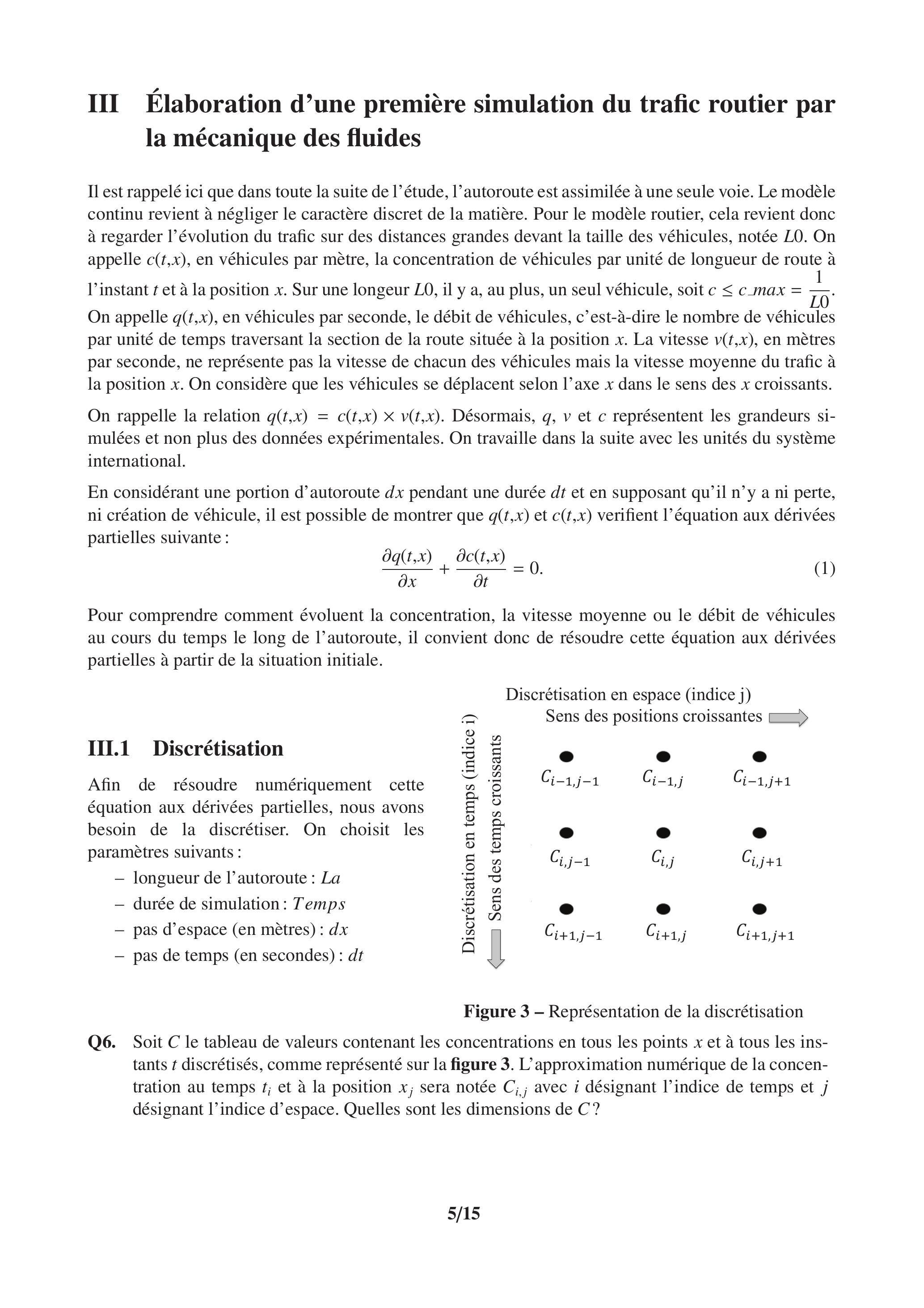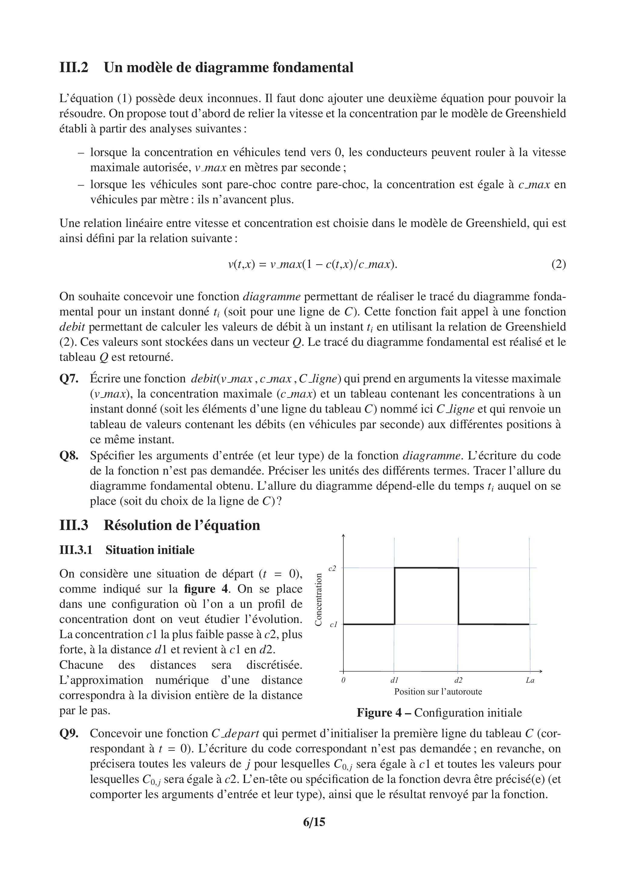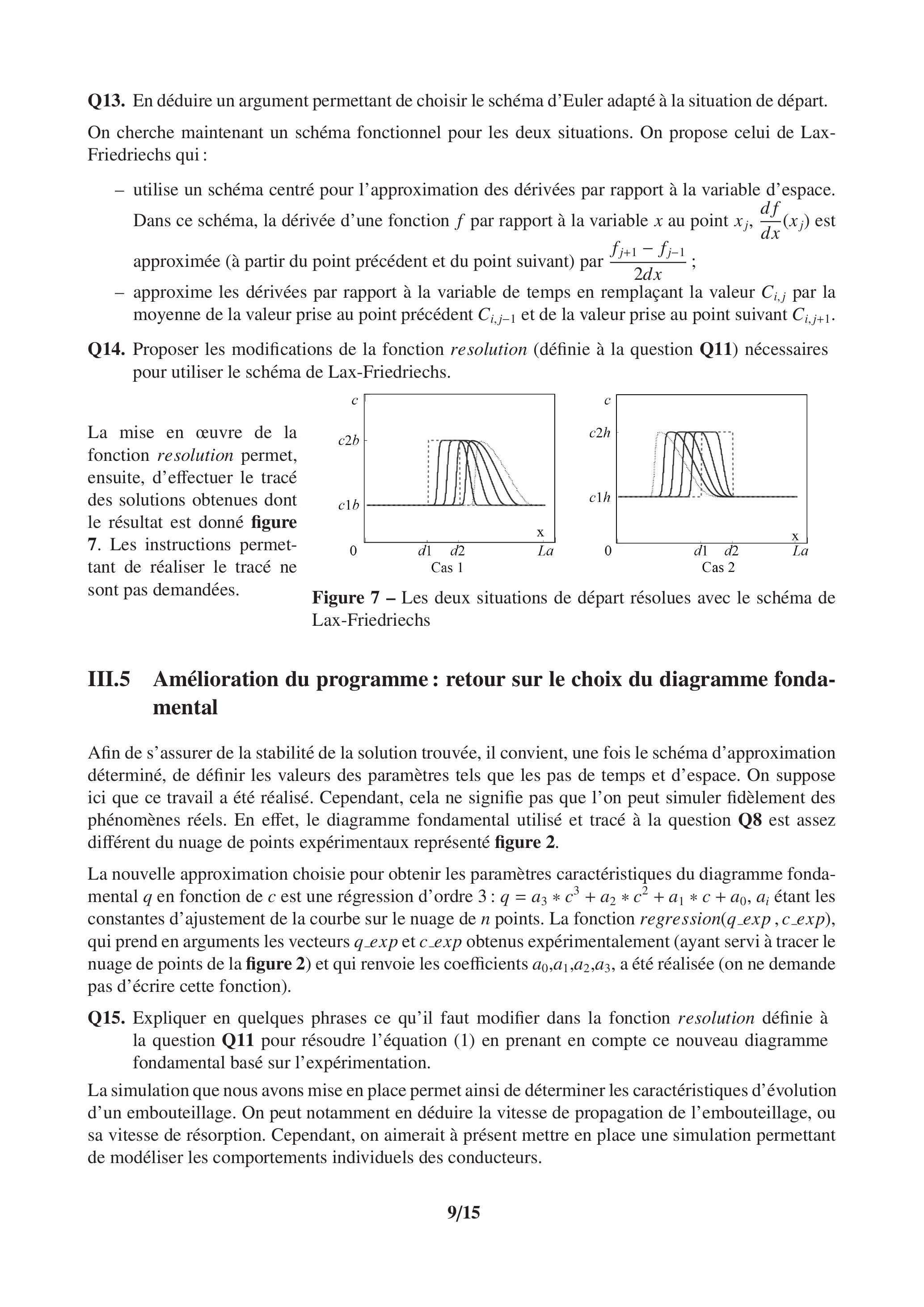 Afin de s'assurer de la stabilité de la solution trouvée, il convient, une fois le schéma d'approximation déterminé, de définir les valeurs des paramètres tels que les pas de temps et d'espace. On suppose ici que ce travail a été réalisé. Cependant, cela ne signifie pas que l'on peut simuler fidèlement des phénomènes réels. En effet, le diagramme fondamental utilisé et tracé à la question Q8 est assez différent du nuage de points expérimentaux représenté figure 2.