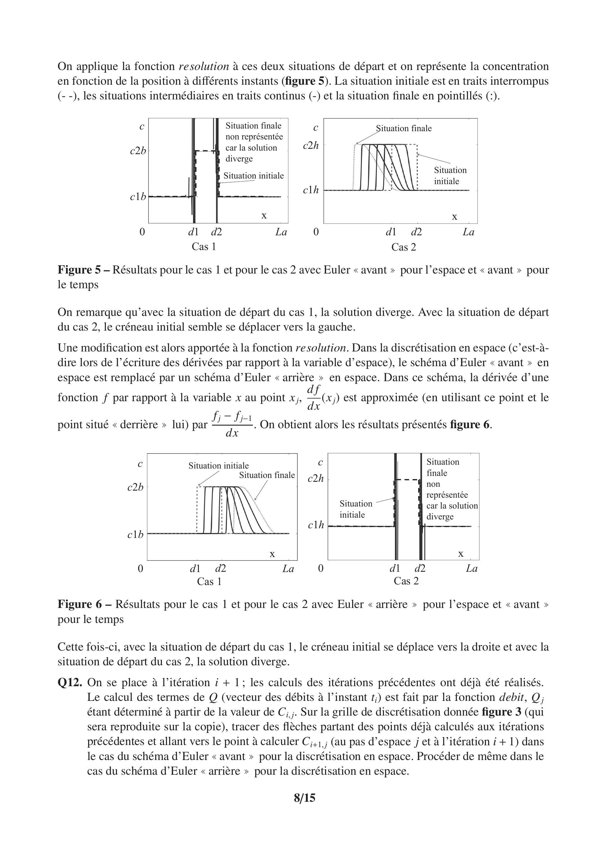 On étudie deux situations de départ basées sur le même profil que celui proposé à la situation initiale (figure 4). Dans le cas 1 , on choisit et , respectivement notées et , correspondant à des concentrations faibles. On peut montrer que, pour ces concentrations, le créneau se déplace vers la droite (dans le sens des croissants) au cours du temps. Cette démonstration n'est pas demandée. Dans le cas 2 , on choisit et , respectivement notées et , correspondant à des concentrations fortes. On peut montrer que, pour ces concentrations, le créneau se déplace vers la gauche (dans le sens des décroissants) au cours du temps. Cette démonstration n'est pas demandée.