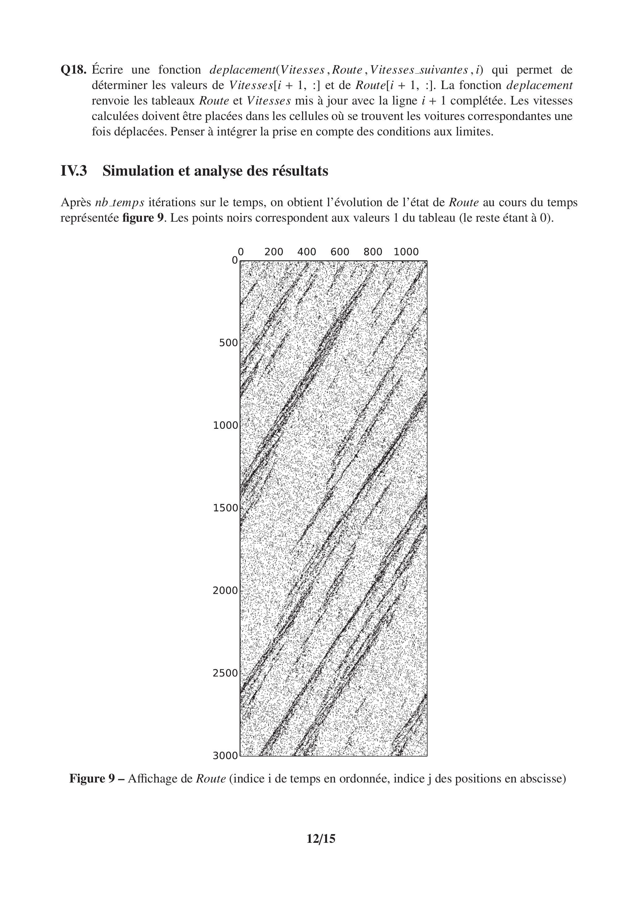 Après nb temps itérations sur le temps, on obtient l'évolution de l'état de Route au cours du temps représentée figure 9. Les points noirs correspondent aux valeurs 1 du tableau (le reste étant à 0 ).