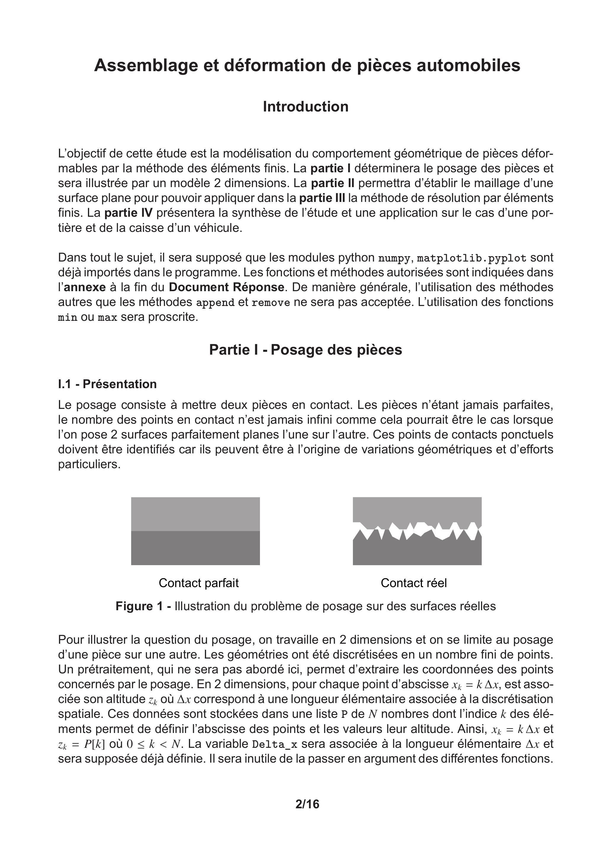 L'objectif de cette étude est la modélisation du comportement géométrique de pièces déformables par la méthode des éléments finis. La partie I déterminera le posage des pièces et sera illustrée par un modèle 2 dimensions. La partie Il permettra d'établir le maillage d'une surface plane pour pouvoir appliquer dans la partie III la méthode de résolution par éléments finis. La partie IV présentera la synthèse de l'étude et une application sur le cas d'une portière et de la caisse d'un véhicule.