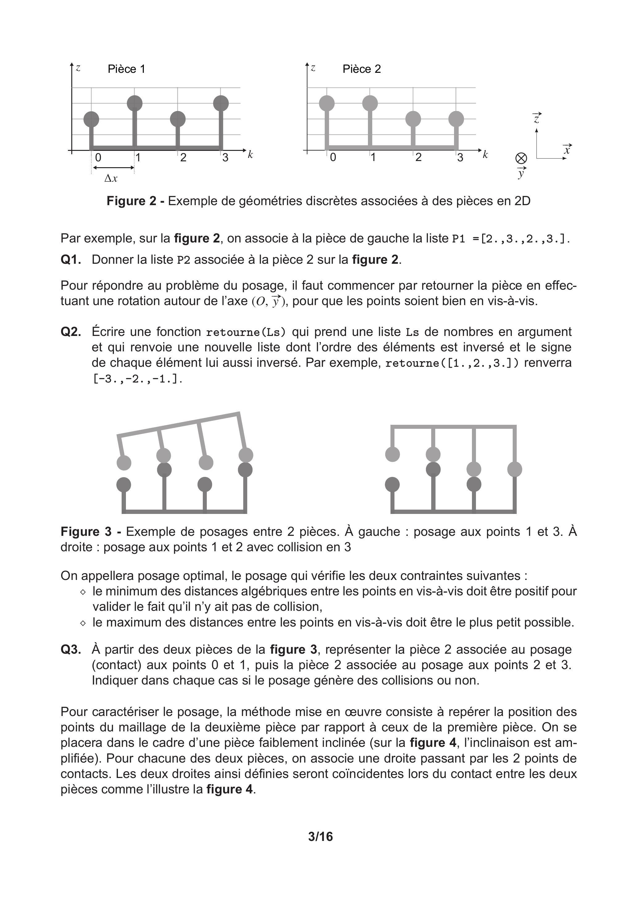 Pour illustrer la question du posage, on travaille en 2 dimensions et on se limite au posage d'une pièce sur une autre. Les géométries ont été discrétisées en un nombre fini de points. Un prétraitement, qui ne sera pas abordé ici, permet d'extraire les coordonnées des points concernés par le posage. En 2 dimensions, pour chaque point d'abscisse , est associée son altitude où correspond à une longueur élémentaire associée à la discrétisation spatiale. Ces données sont stockées dans une liste P de nombres dont l'indice des éléments permet de définir l'abscisse des points et les valeurs leur altitude. Ainsi, et où . La variable Delta_x sera associée à la longueur élémentaire et sera supposée déjà définie. Il sera inutile de la passer en argument des différentes fonctions.