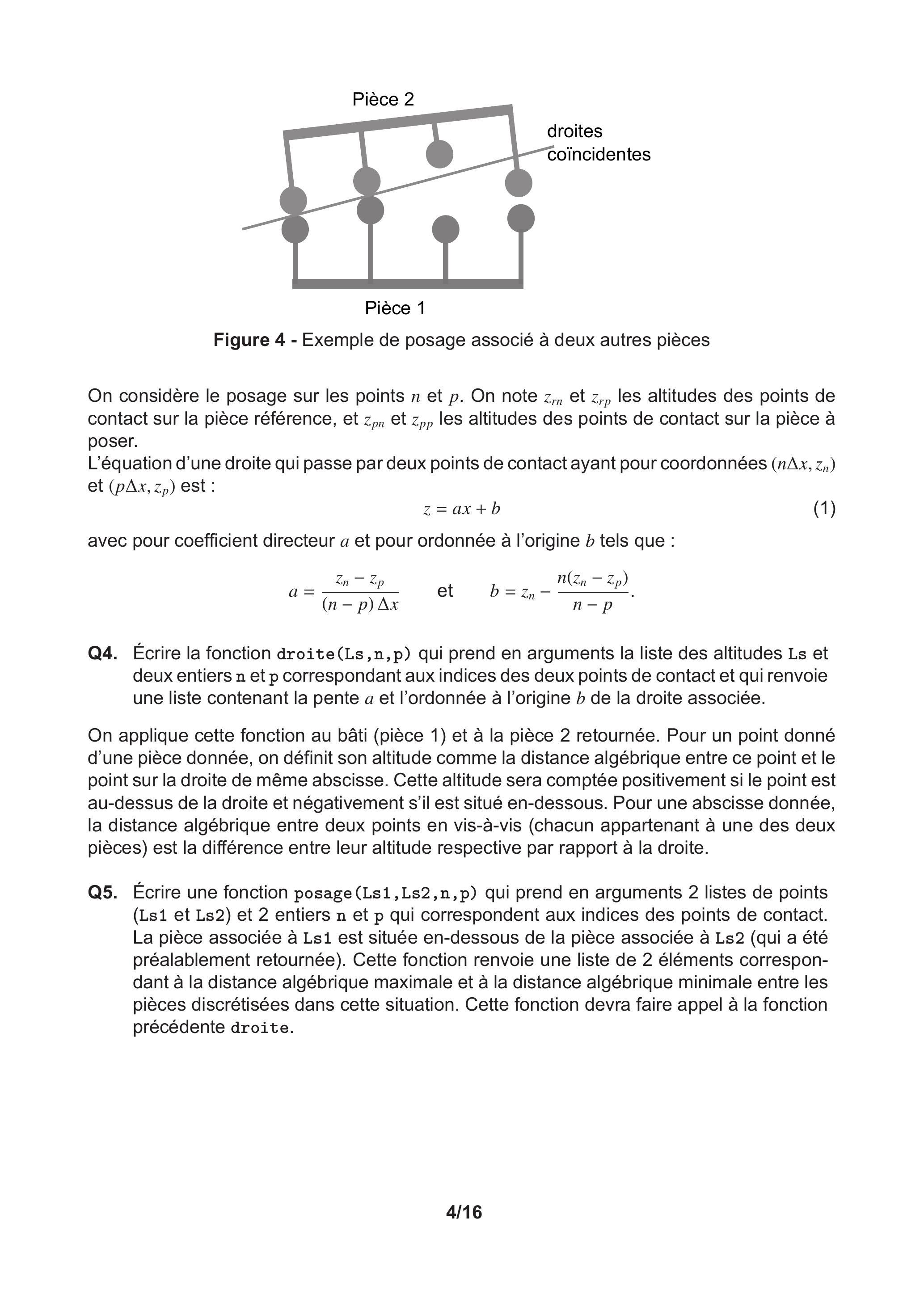 Q5. Écrire une fonction posage( ) qui prend en arguments 2 listes de points (Ls1 et Ls2) et 2 entiers et qui correspondent aux indices des points de contact. La pièce associée à Ls1 est située en-dessous de la pièce associée à Ls2 (qui a été préalablement retournée). Cette fonction renvoie une liste de 2 éléments correspondant à la distance algébrique maximale et à la distance algébrique minimale entre les pièces discrétisées dans cette situation. Cette fonction devra faire appel à la fonction précédente droite.
