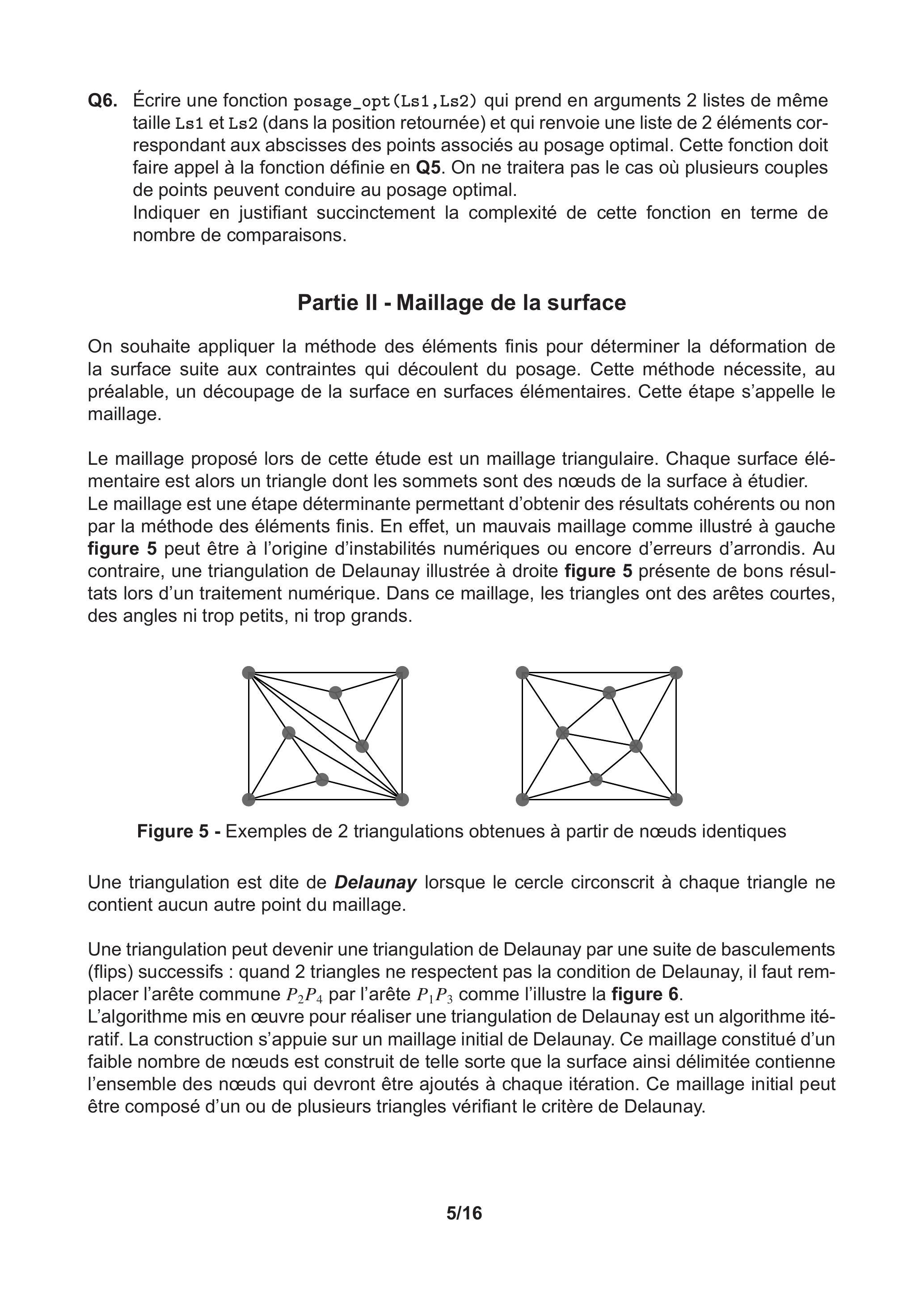 Q12. Écrire la fonction delaunay (noeud) qui prend en arguments un tableau de nœuds (de dimension ) et qui renvoie la liste des triangles T correspondant à une triangulation de Delaunay. Cette fonction pourra utiliser les fonctions insideT, addT et checkedge déjà définies. On considère toujours que chaque nœud inséré est strictement inclus dans un triangle de la distribution. De plus, les 4 premiers éléments du tableau noeud permettent d'initialiser le tableau des triangles : .