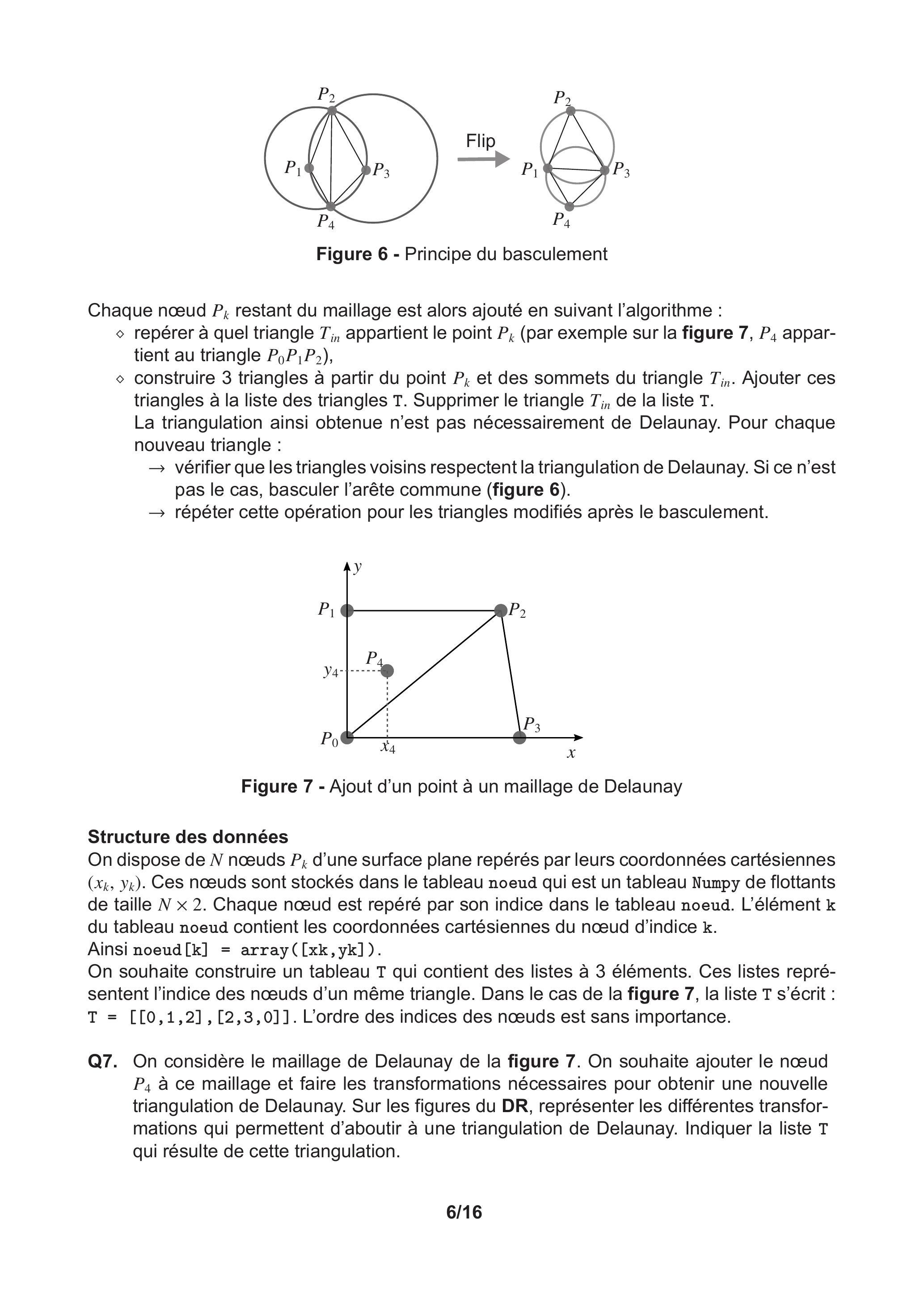 Q7. On considère le maillage de Delaunay de la figure 7. On souhaite ajouter le nœud à ce maillage et faire les transformations nécessaires pour obtenir une nouvelle triangulation de Delaunay. Sur les figures du DR, représenter les différentes transformations qui permettent d'aboutir à une triangulation de Delaunay. Indiquer la liste T qui résulte de cette triangulation.
