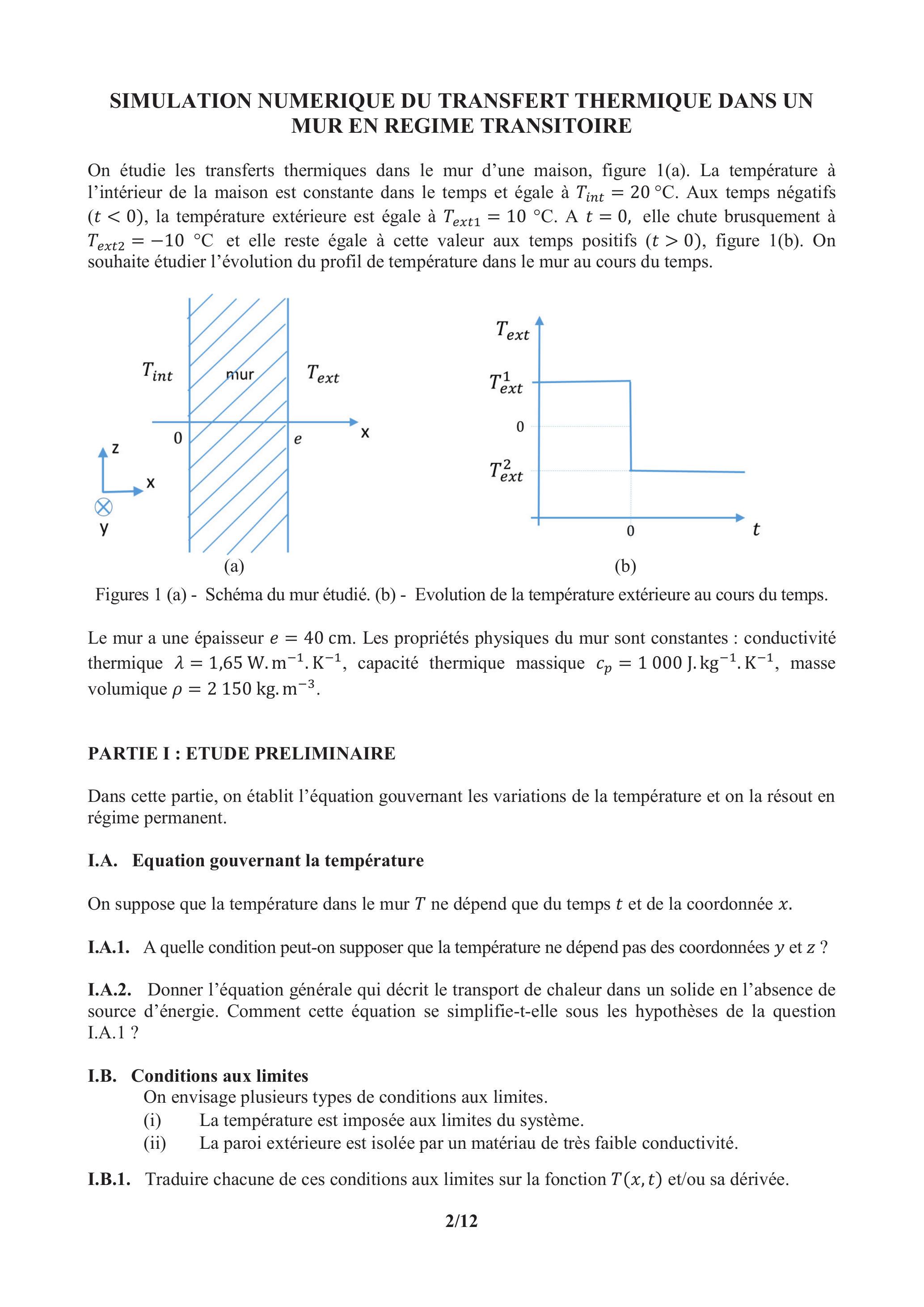 Le mur a une épaisseur . Les propriétés physiques du mur sont constantes : conductivité thermique , capacité thermique massique , masse volumique .