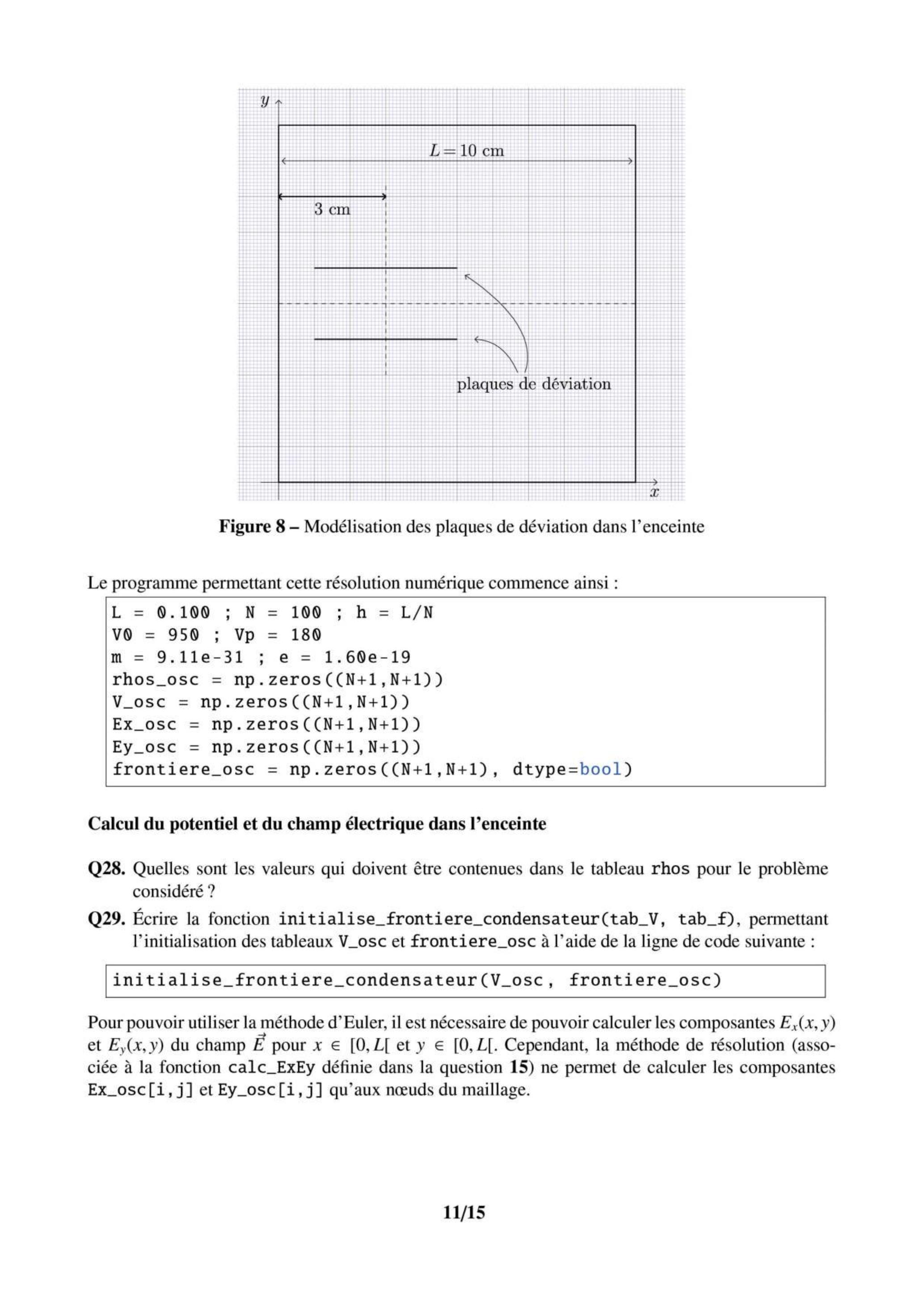 Q15. Expliquer rapidement comment il serait possible de définir la fonction calc_ExEy(Ex, Ey, V , h ), permettant, à partir du tableau V et du pas du maillage h , le remplissage des deux tableaux Ex et Ey passés en arguments.