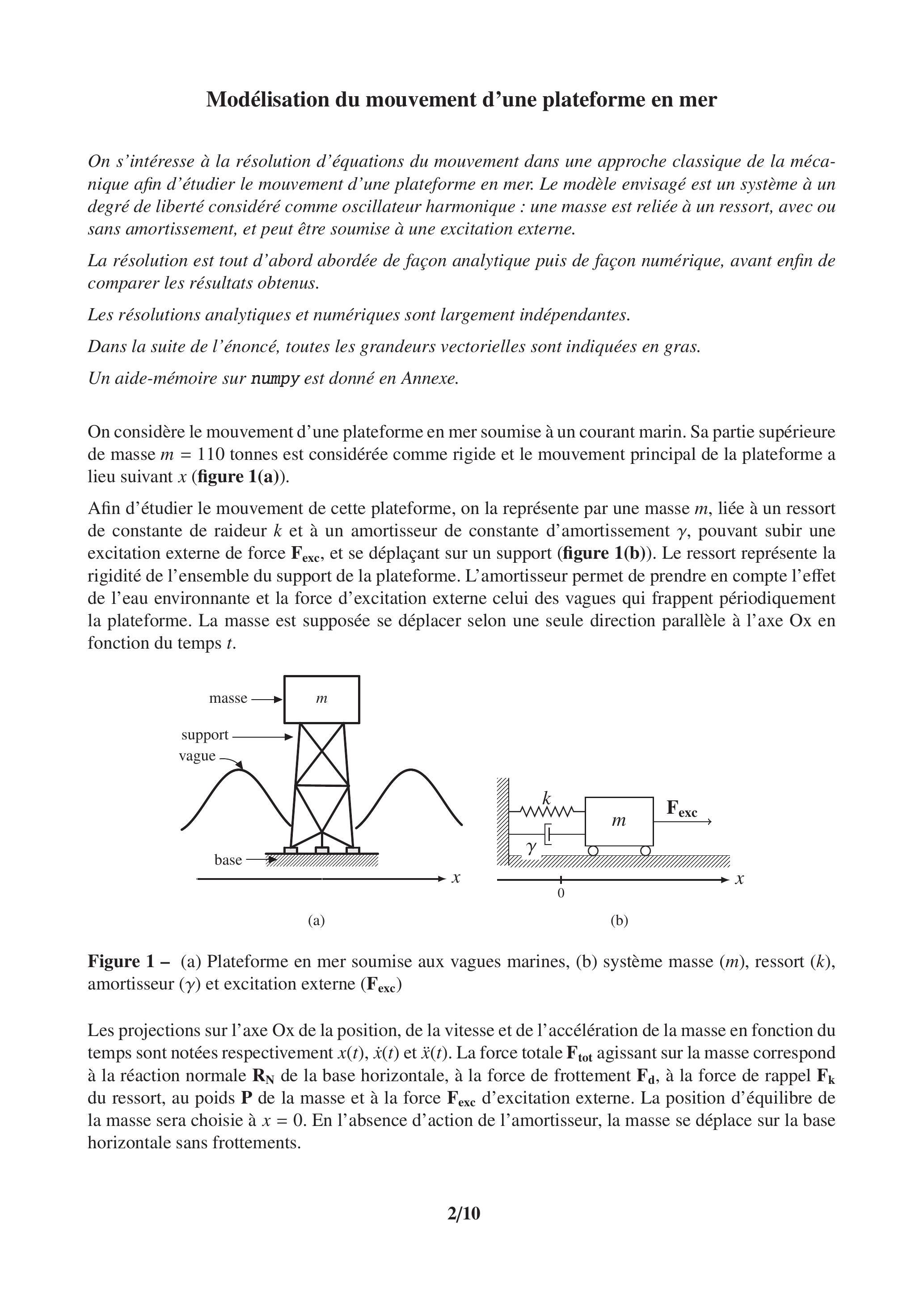 On s'intéresse à la résolution d'équations du mouvement dans une approche classique de la mécanique afin d'étudier le mouvement d'une plateforme en mer. Le modèle envisagé est un système à un degré de liberté considéré comme oscillateur harmonique : une masse est reliée à un ressort, avec ou sans amortissement, et peut être soumise à une excitation externe.