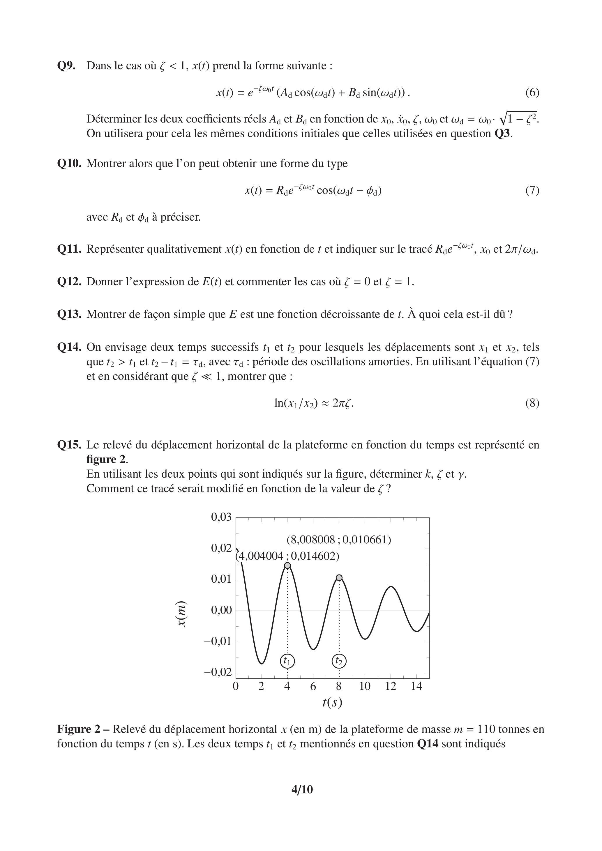 Q14. On envisage deux temps successifs et pour lesquels les déplacements sont et , tels que et , avec : période des oscillations amorties. En utilisant l'équation (7) et en considérant que , montrer que :