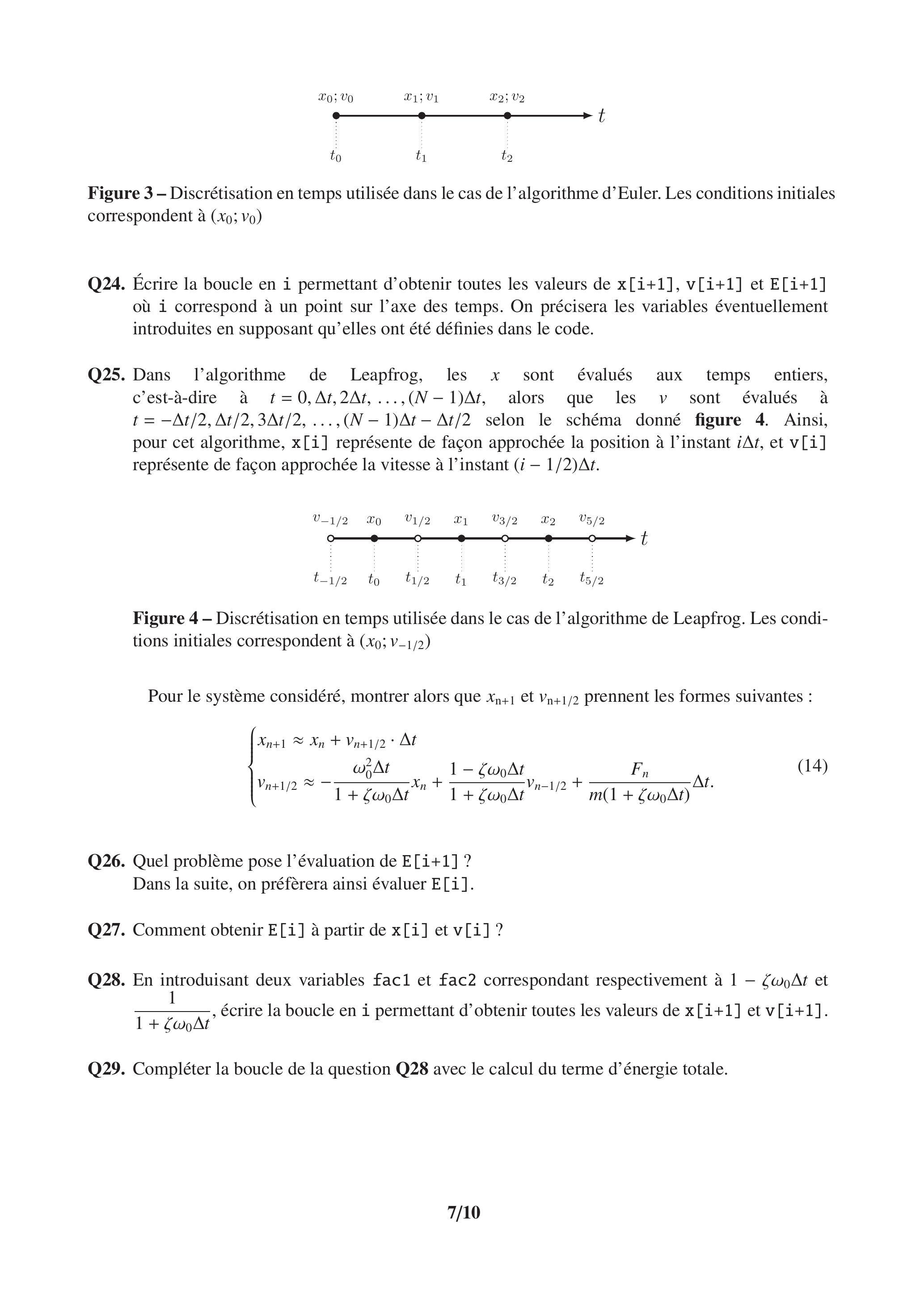 Q25. Dans l'algorithme de Leapfrog, les sont évalués aux temps entiers, c'est-à-dire à , alors que les sont évalués à selon le schéma donné figure 4. Ainsi, pour cet algorithme, représente de façon approchée la position à l'instant , et représente de façon approchée la vitesse à l'instant .