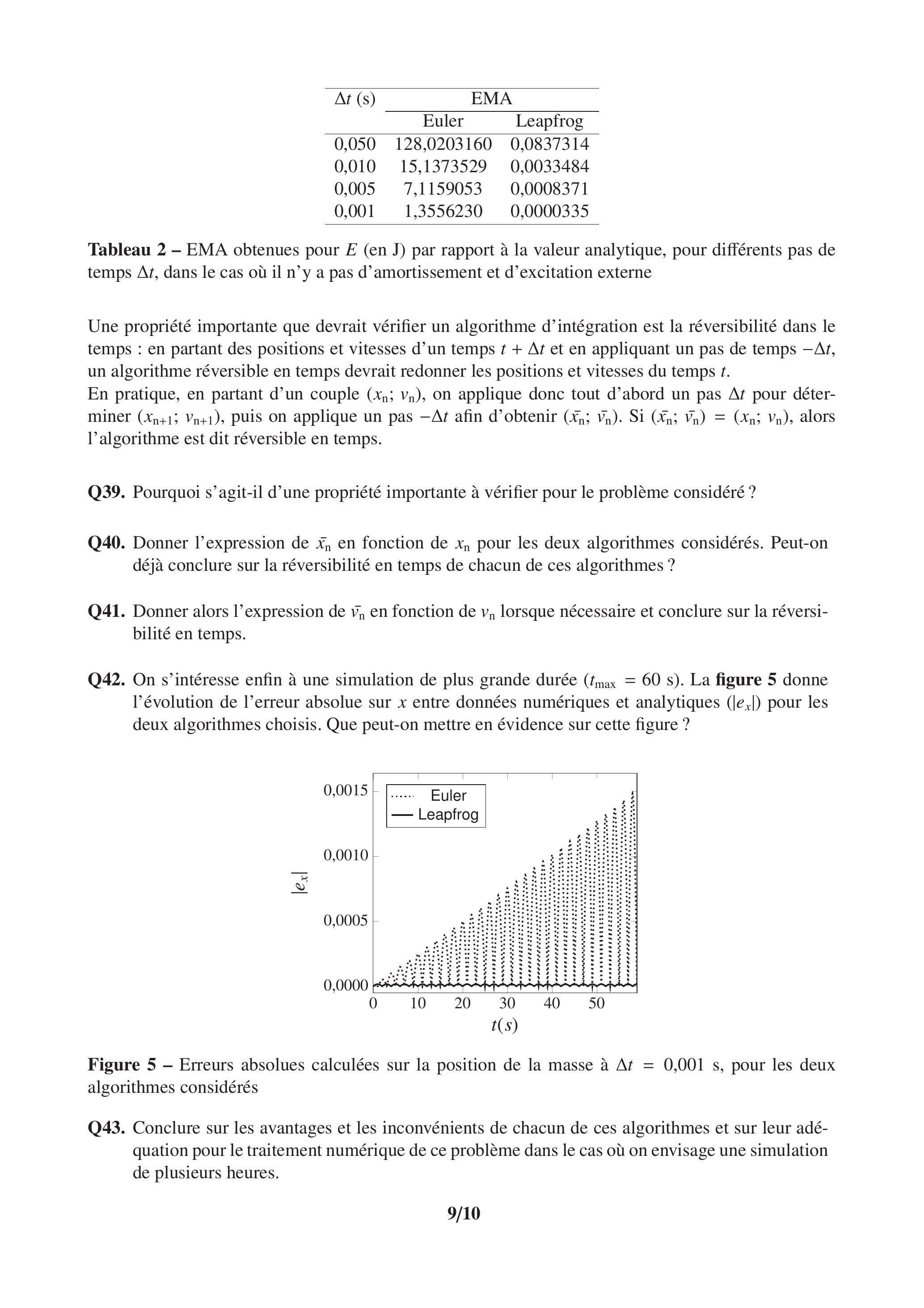Q38. Dans le cas simple de l'algorithme d'Euler, comment augmente lorsqu' on passe de à ? Relier alors ce résultat aux données du tableau 2.