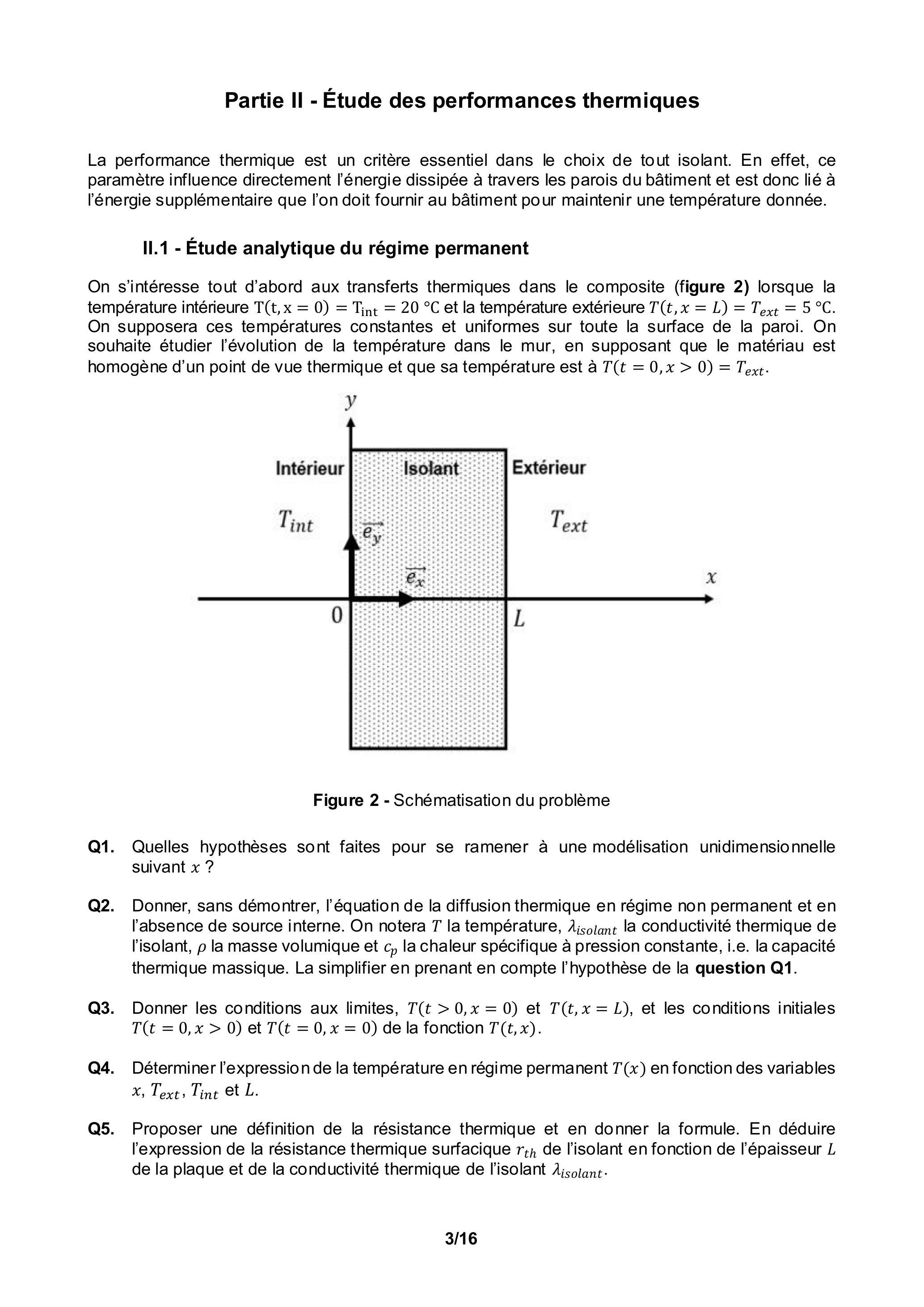 On s'intéresse tout d'abord aux transferts thermiques dans le composite (figure 2) lorsque la température intérieure et la température extérieure . On supposera ces températures constantes et uniformes sur toute la surface de la paroi. On souhaite étudier l'évolution de la température dans le mur, en supposant que le matériau est homogène d'un point de vue thermique et que sa température est à .