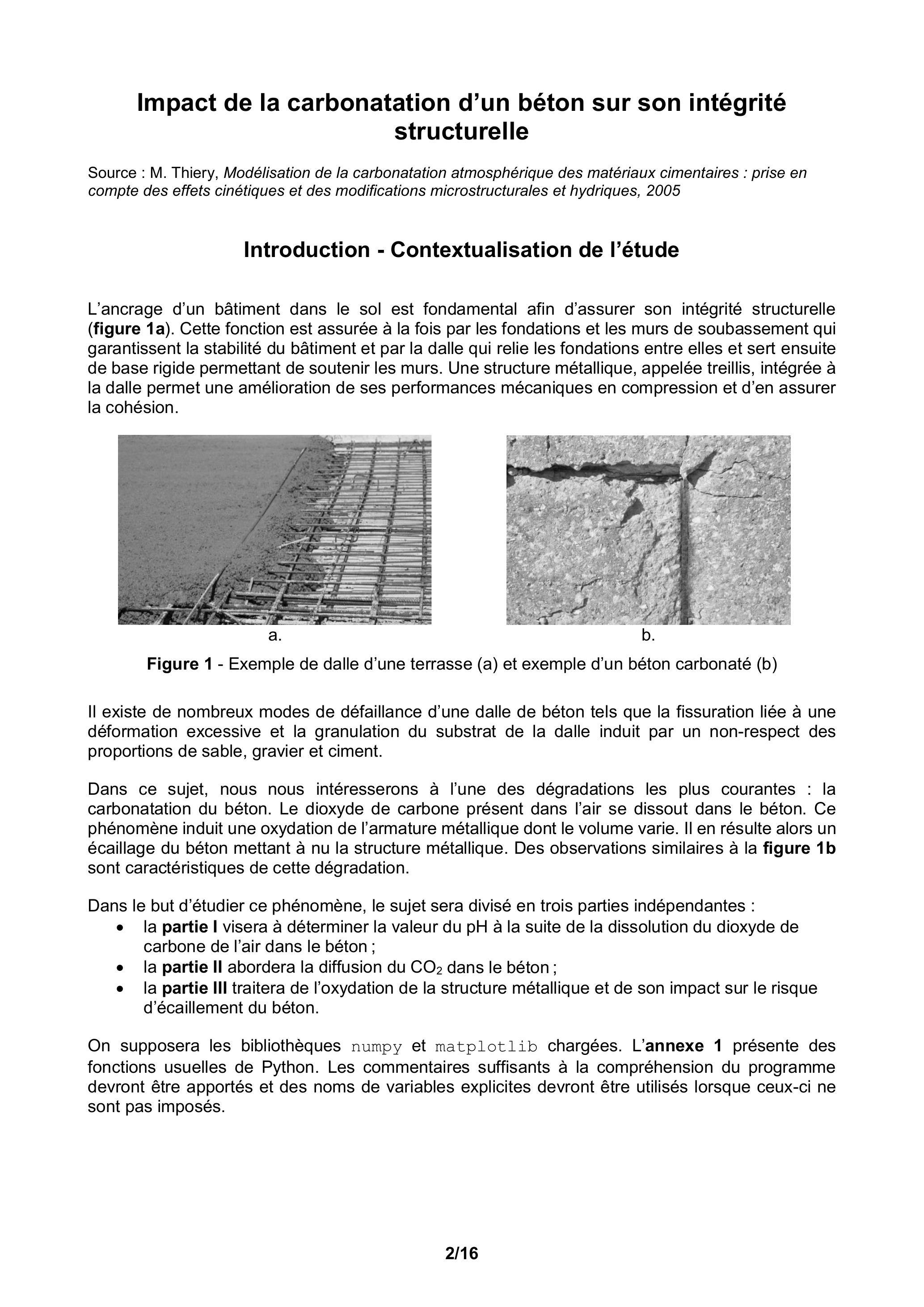 Dans ce sujet, nous nous intéresserons à l'une des dégradations les plus courantes: la carbonatation du béton. Le dioxyde de carbone présent dans l'air se dissout dans le béton. Ce phénomène induit une oxydation de l'armature métallique dont le volume varie. Il en résulte alors un écaillage du béton mettant à nu la structure métallique. Des observations similaires à la figure 1b sont caractéristiques de cette dégradation.