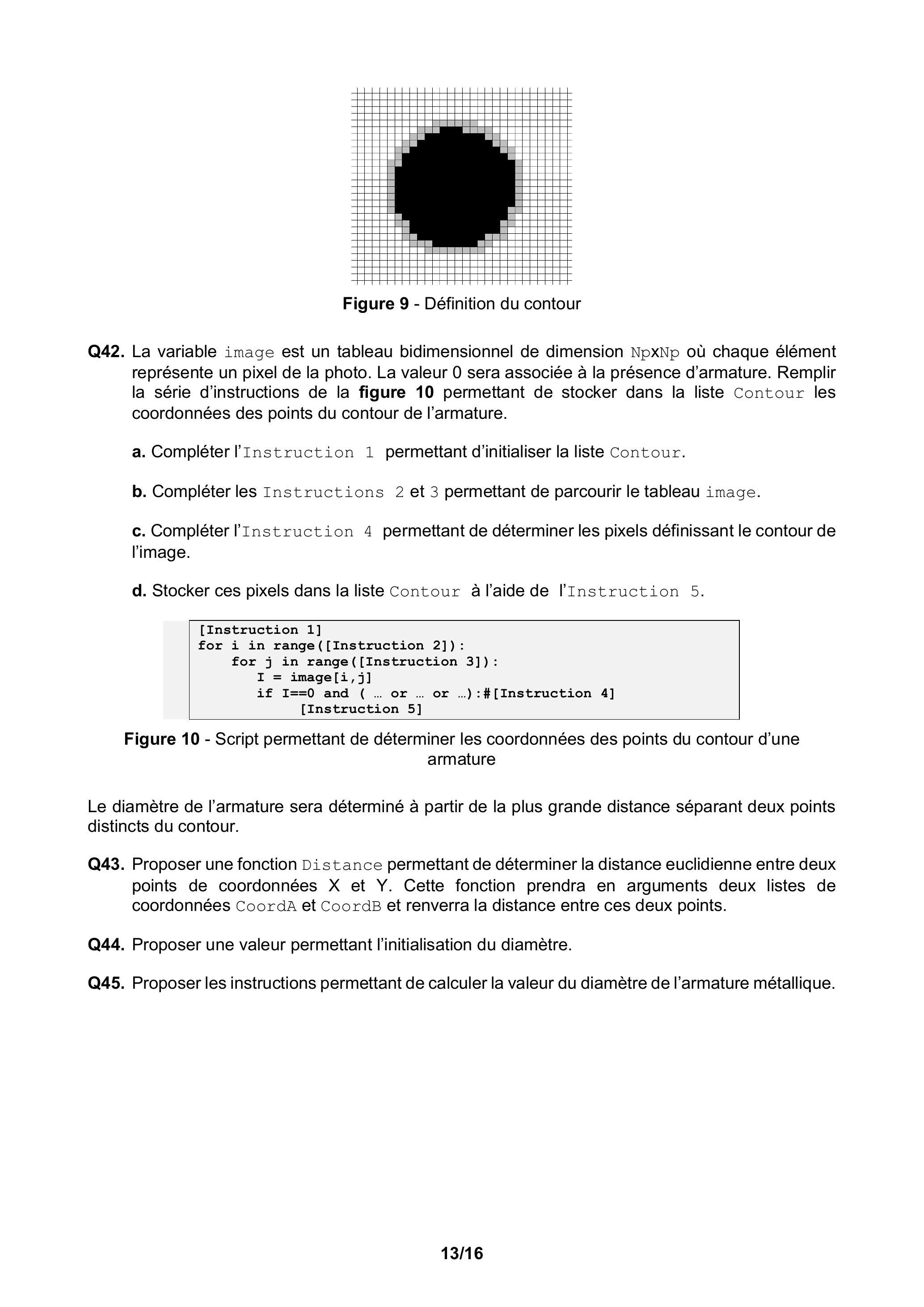 Q42. La variable image est un tableau bidimensionnel de dimension NpxNp où chaque élément représente un pixel de la photo. La valeur 0 sera associée à la présence d'armature. Remplir la série d'instructions de la figure 10 permettant de stocker dans la liste Contour les coordonnées des points du contour de l'armature.