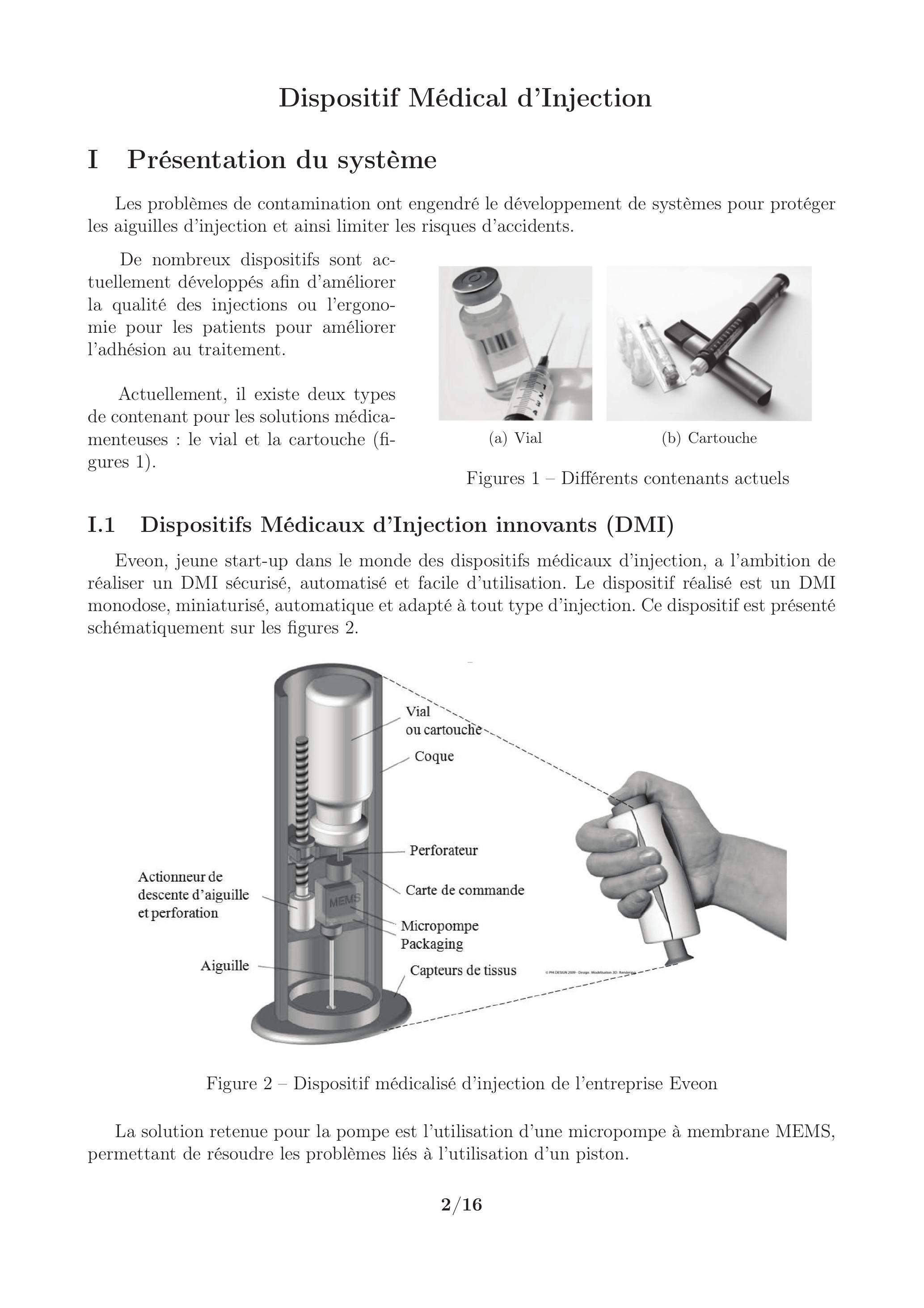 Eveon, jeune start-up dans le monde des dispositifs médicaux d'injection, a l'ambition de réaliser un DMI sécurisé, automatisé et facile d'utilisation. Le dispositif réalisé est un DMI monodose, miniaturisé, automatique et adapté à tout type d'injection. Ce dispositif est présenté schématiquement sur les figures 2.