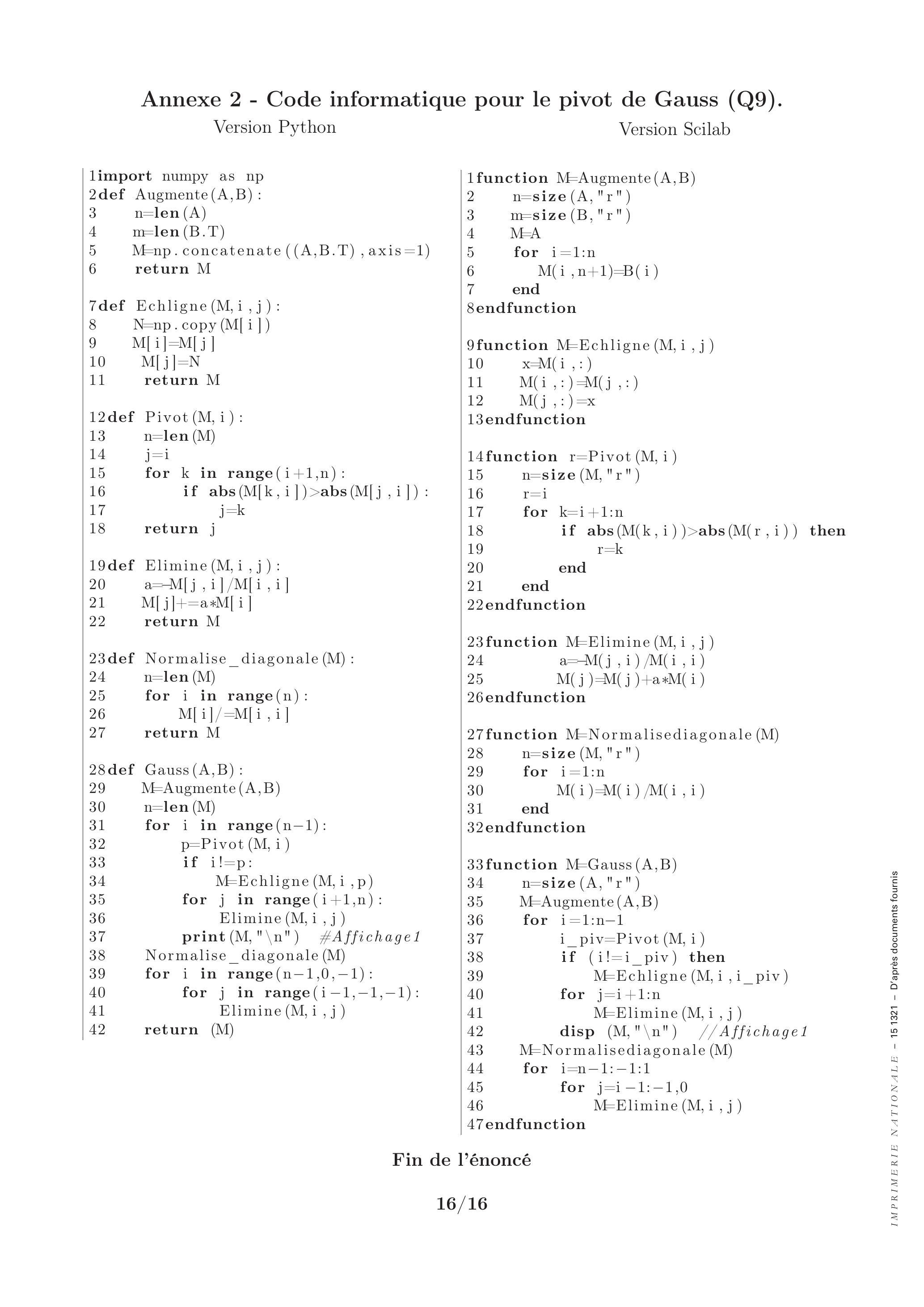 Annexe 2 - Code informatique pour le pivot de Gauss (Q9).