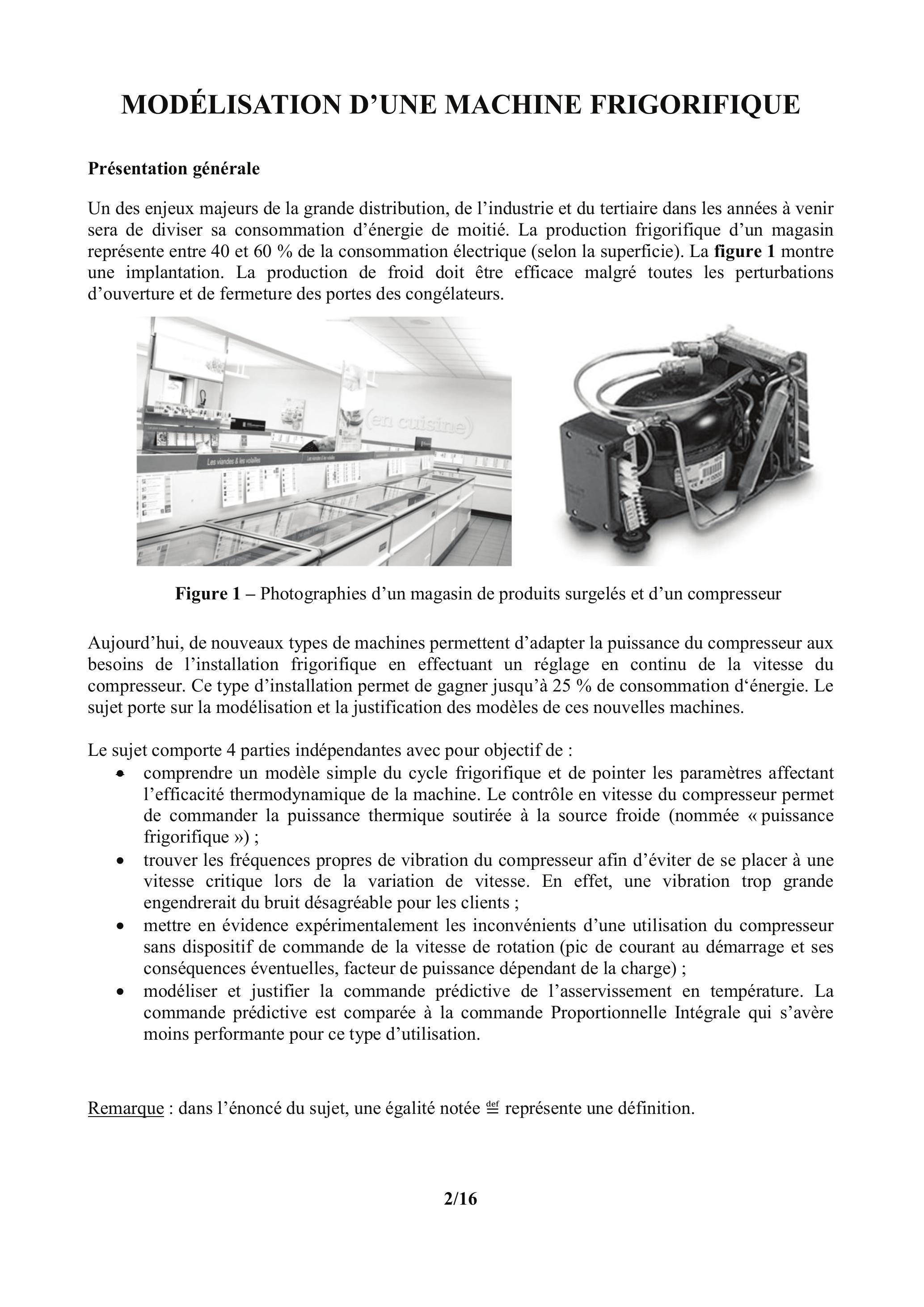 comprendre un modèle simple du cycle frigorifique et de pointer les paramètres affectant l'efficacité thermodynamique de la machine. Le contrôle en vitesse du compresseur permet de commander la puissance thermique soutirée à la source froide (nommée «puissance frigorifique ») ;