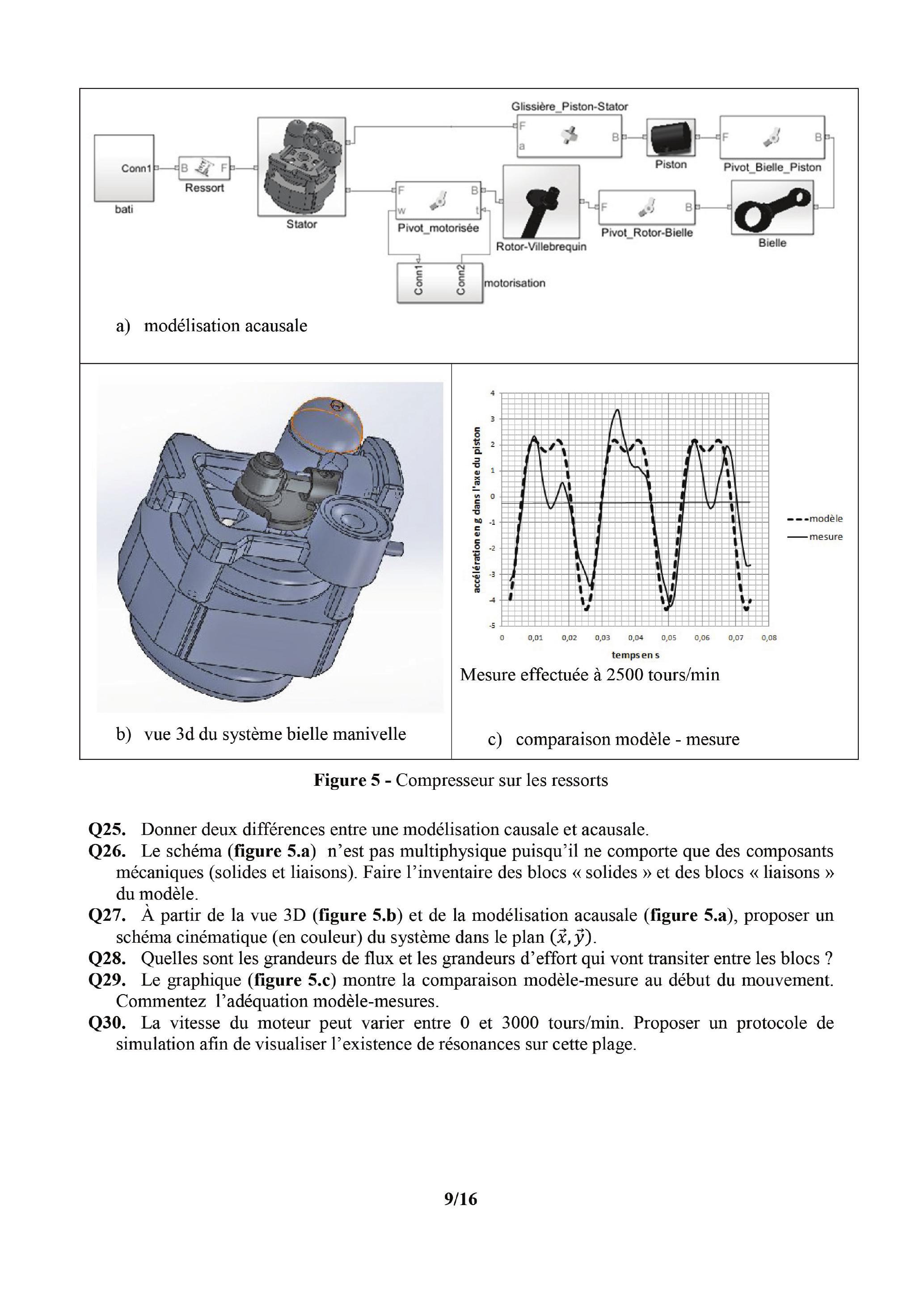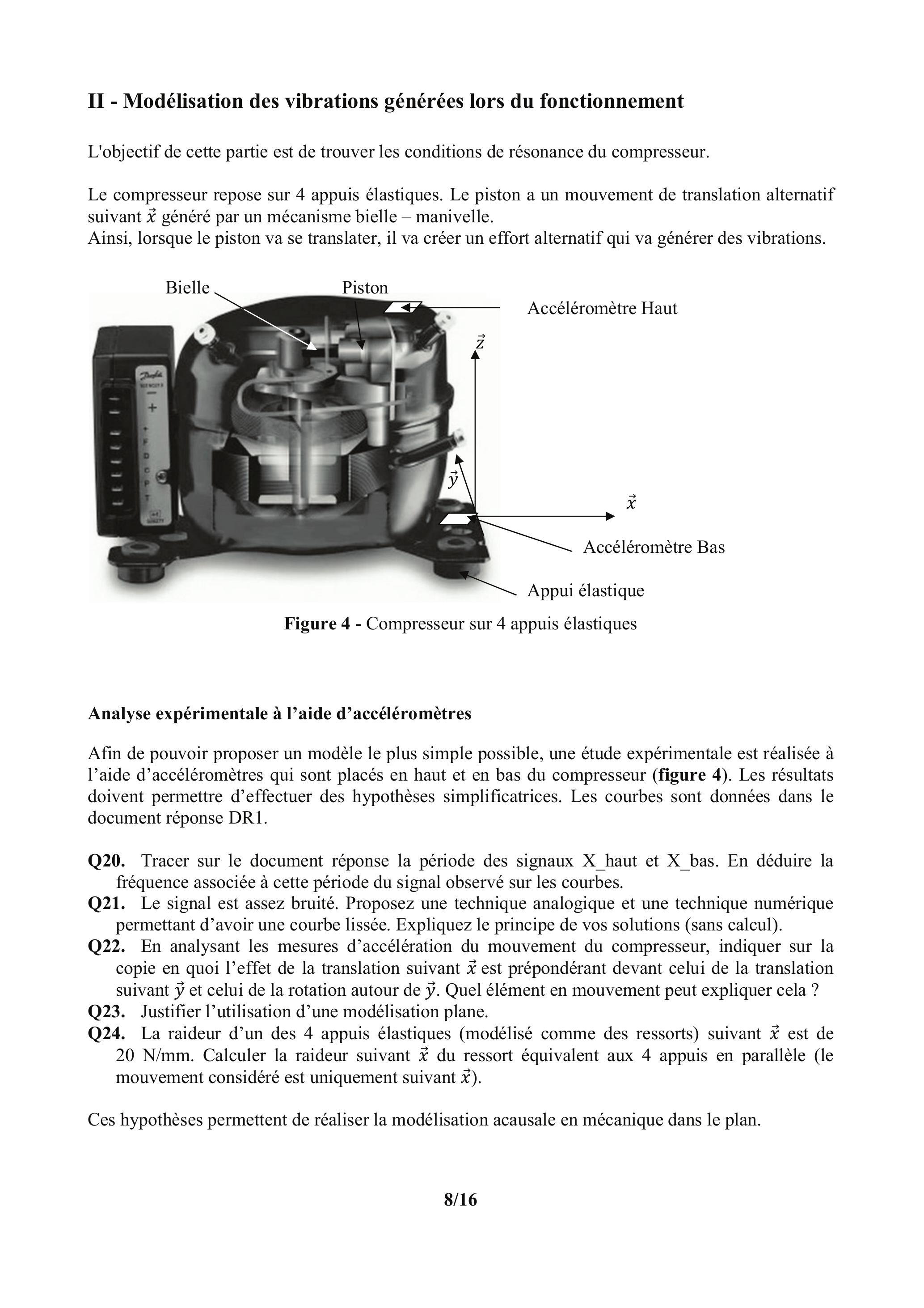 Afin de pouvoir proposer un modèle le plus simple possible, une étude expérimentale est réalisée à l'aide d'accéléromètres qui sont placés en haut et en bas du compresseur (figure 4). Les résultats doivent permettre d'effectuer des hypothèses simplificatrices. Les courbes sont données dans le document réponse DR1.