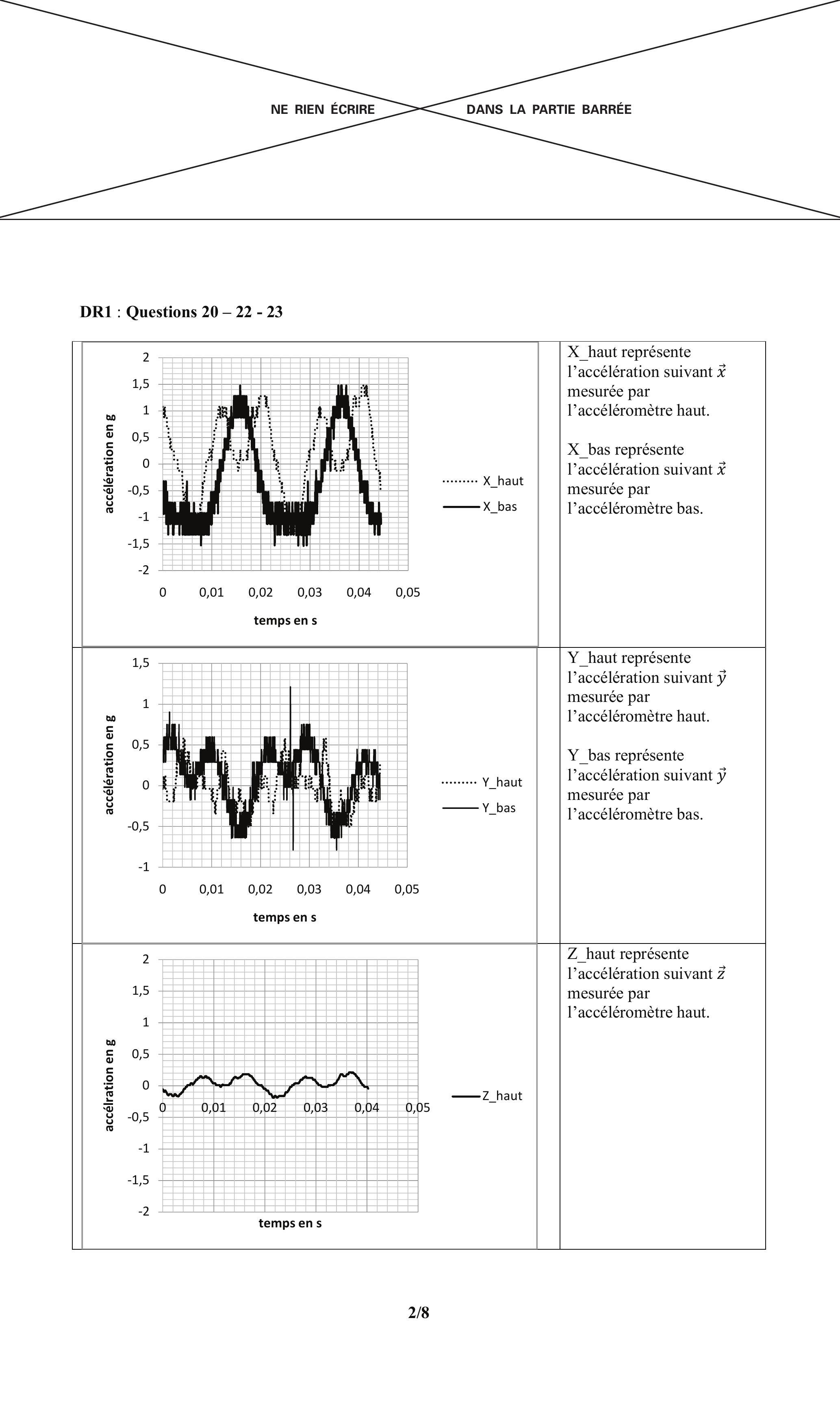 Q22. En analysant les mesures d'accélération du mouvement du compresseur, indiquer sur la copie en quoi l'effet de la translation suivant est prépondérant devant celui de la translation suivant et celui de la rotation autour de . Quel élément en mouvement peut expliquer cela?