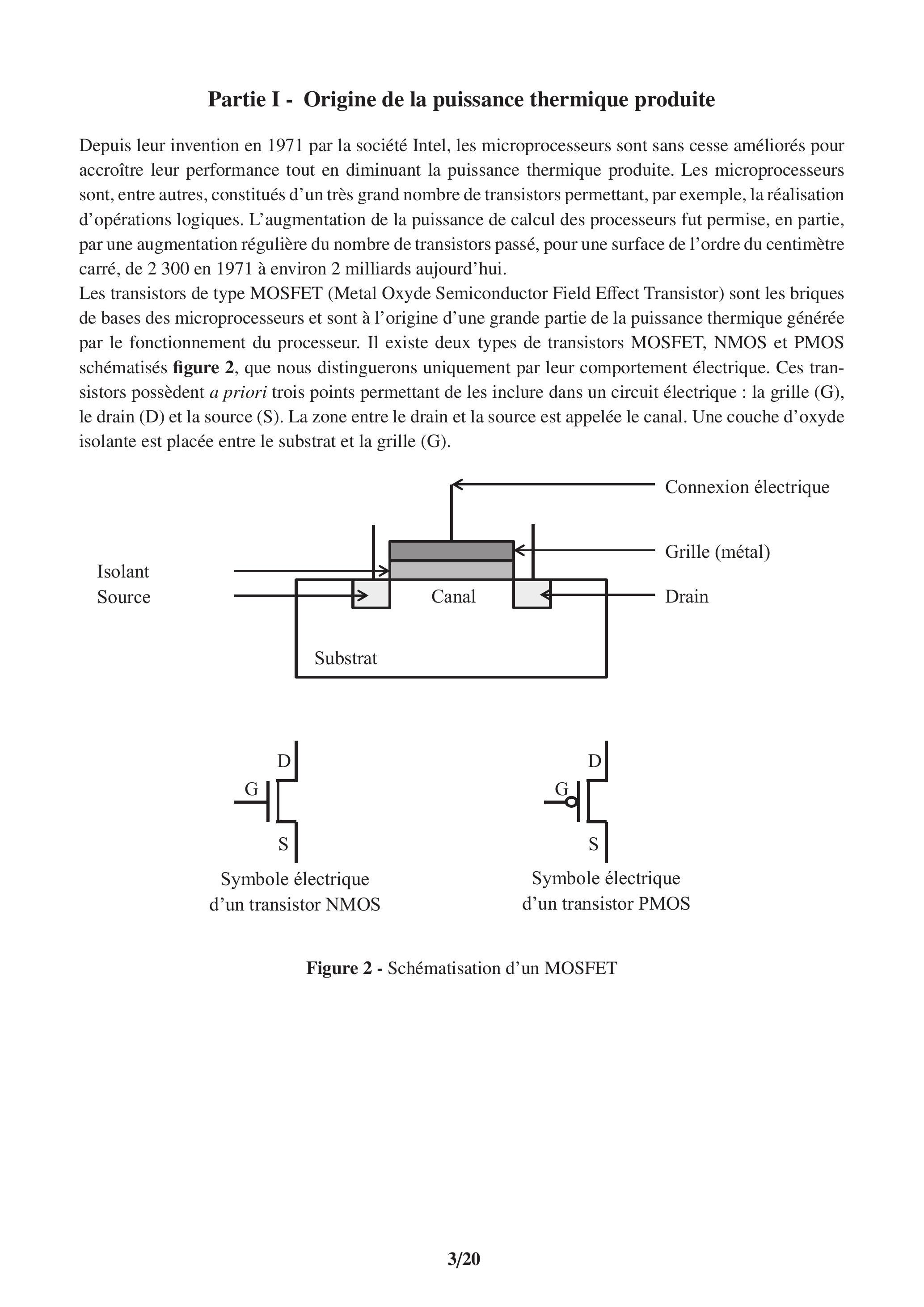 Les transistors de type MOSFET (Metal Oxyde Semiconductor Field Effect Transistor) sont les briques de bases des microprocesseurs et sont à l'origine d'une grande partie de la puissance thermique générée par le fonctionnement du processeur. Il existe deux types de transistors MOSFET, NMOS et PMOS schématisés figure 2, que nous distinguerons uniquement par leur comportement électrique. Ces transistors possèdent a priori trois points permettant de les inclure dans un circuit électrique : la grille (G), le drain (D) et la source (S). La zone entre le drain et la source est appelée le canal. Une couche d'oxyde isolante est placée entre le substrat et la grille (G).