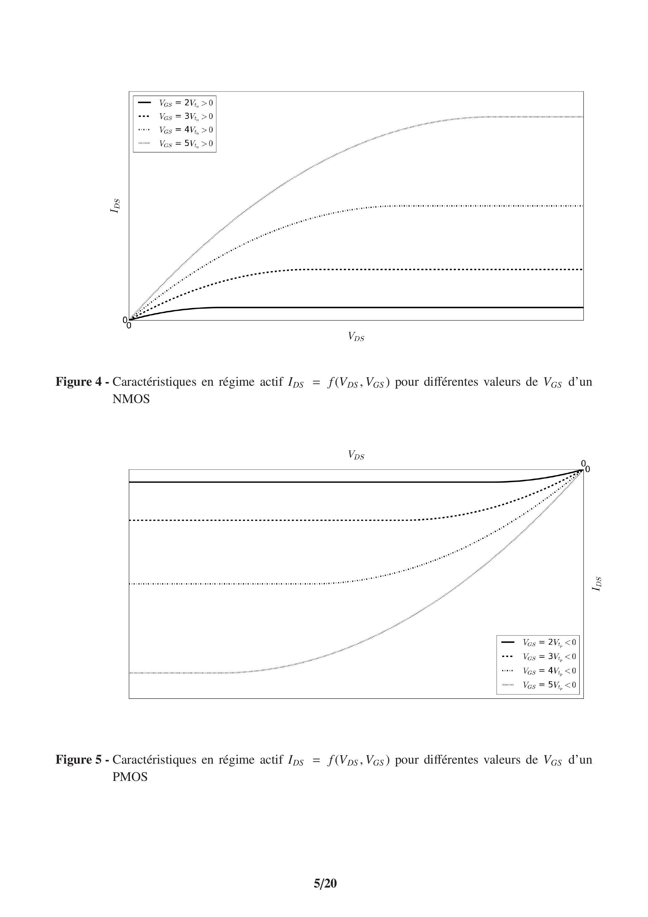 La tension correspondant au passage d'un régime à l'autre est appelée tension seuil. On note (respectivement ) la tension seuil du transistor NMOS (respectivement PMOS), la tension entre la grille et la source, la tension entre le drain et la source et l'intensité du courant traversant le canal du drain vers la source. Un résumé schématique du fonctionnement simplifié du transistor NMOS est présenté figure 3 (le fonctionnement du PMOS est similaire, seul le signe des tensions change). En régime actif, l'intensité dépend des tensions et . Les figures et présentent des réseaux de caractéristiques pour différentes valeurs de .
