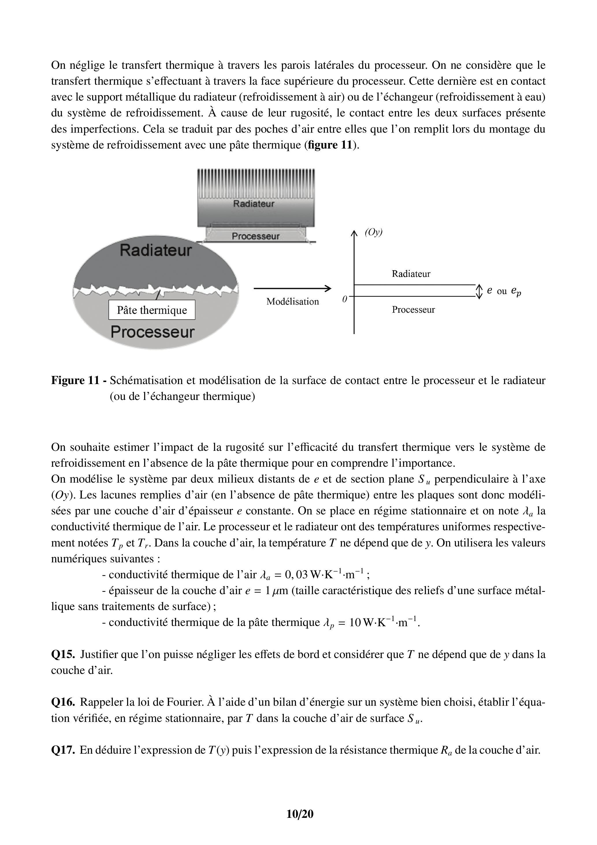 On modélise le système par deux milieux distants de et de section plane perpendiculaire à l'axe (Oy). Les lacunes remplies d'air (en l'absence de pâte thermique) entre les plaques sont donc modélisées par une couche d'air d'épaisseur constante. On se place en régime stationnaire et on note la conductivité thermique de l'air. Le processeur et le radiateur ont des températures uniformes respectivement notées et . Dans la couche d'air, la température ne dépend que de . On utilisera les valeurs numériques suivantes :